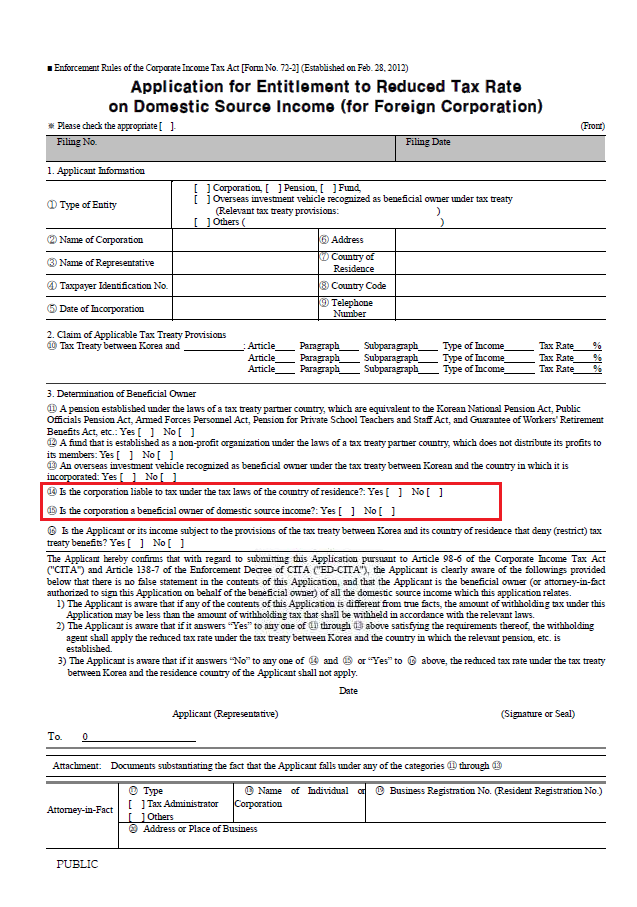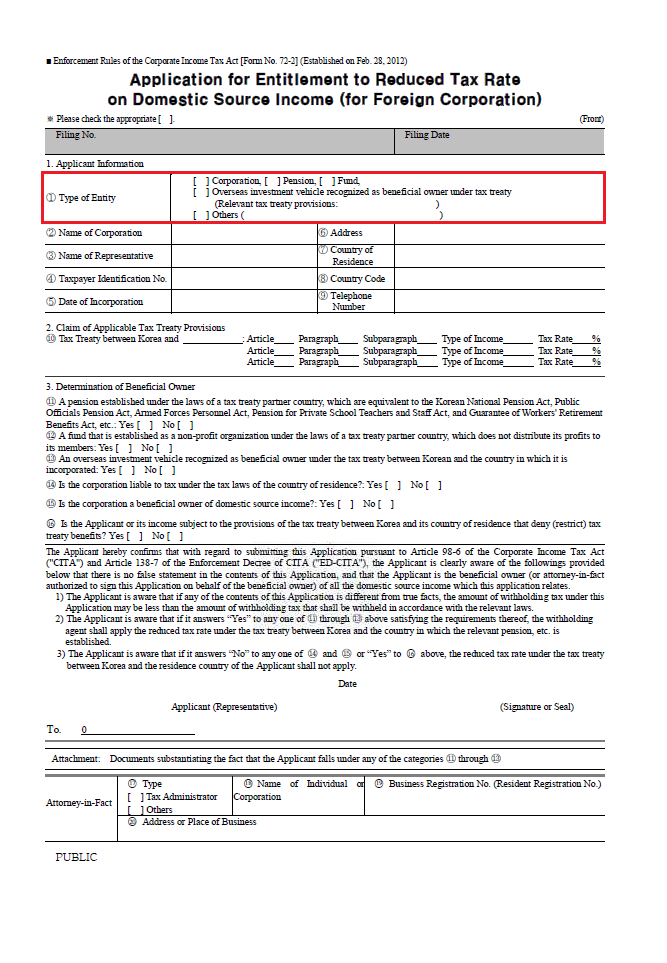 If the Applicant is a manufacturing company, bank, financial company, or other incorporated as a company who is the actual beneficial owner of the Korean income, then in general the Applicant would select “corporation” as beneficial owner on the Application for Entitlement to Reduced Tax Rate on Domestic Source Income (for Foreign Corporation) [Form No. 72-2], item 1