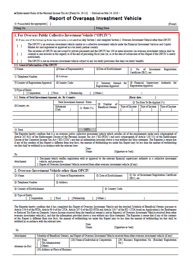 The tax form will need to be submitted where it classifies the beneficial owners by each country at the time of submitting the Report. The Korea Tax Authority has explained that the composition of unit holders of a public fund can change on a daily basis, therefore, in principle the report would need to be resubmitted on a daily basis. If, however, it is considerably difficult to resubmit the Report, the Korea Tax Authority explained that the report can be prepared and be submitted by using the information as at the end of the preceding half-year from which the Report is submitted (the Report can be submitted once every half-year) or the status of investors can be based on any date going backwards within 6 calendar months from the date of income payment date.