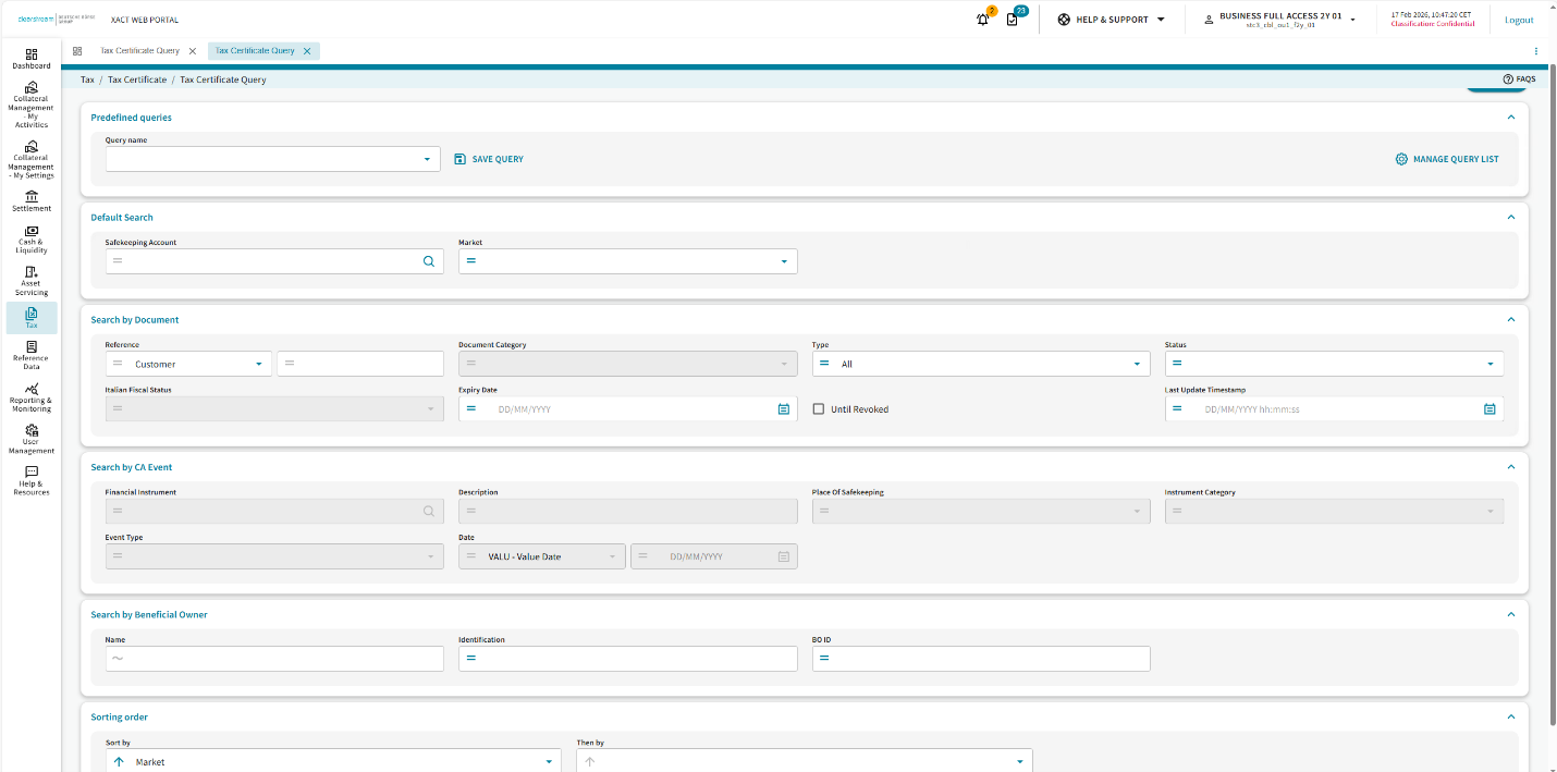 In this upcoming release, Clearstream will introduce a new user interface and experience for the Tax Certificate Query section in Xact Web Portal. These changes will improve the experience of users accessing their Tax queries.