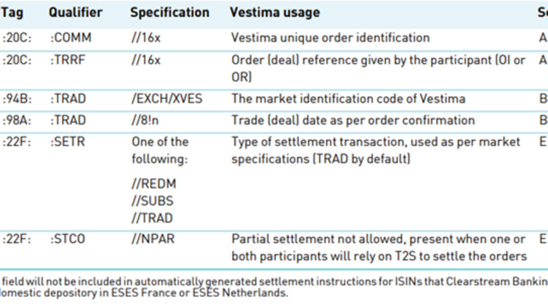 Participants (the OI and the OR) can specify that settlement instructions are to be generated automatically by Vestima for an order. Vestima can generate both securities and cash instructions. If the settlement instructions are generated automatically by Clearstream Fund Centre (“locked-in settlement”), the risk of error associated with settlement is avoided.