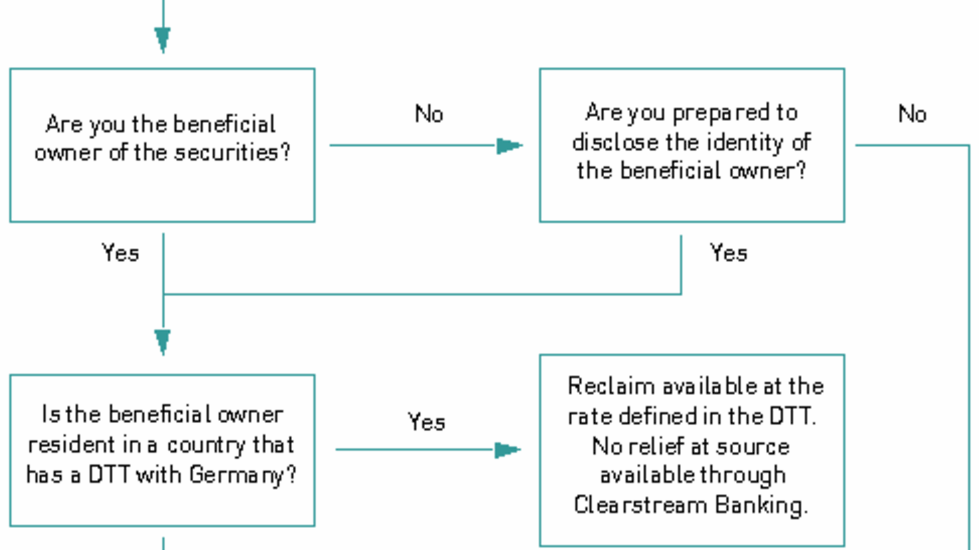 Relief at source for beneficiaries other than certified investment funds is not available through Clearstream. Quick refund is possible for investment funds with unlimited tax liability (“unbeschränkt körperschaftsteuerpflichtig”) in Germany.