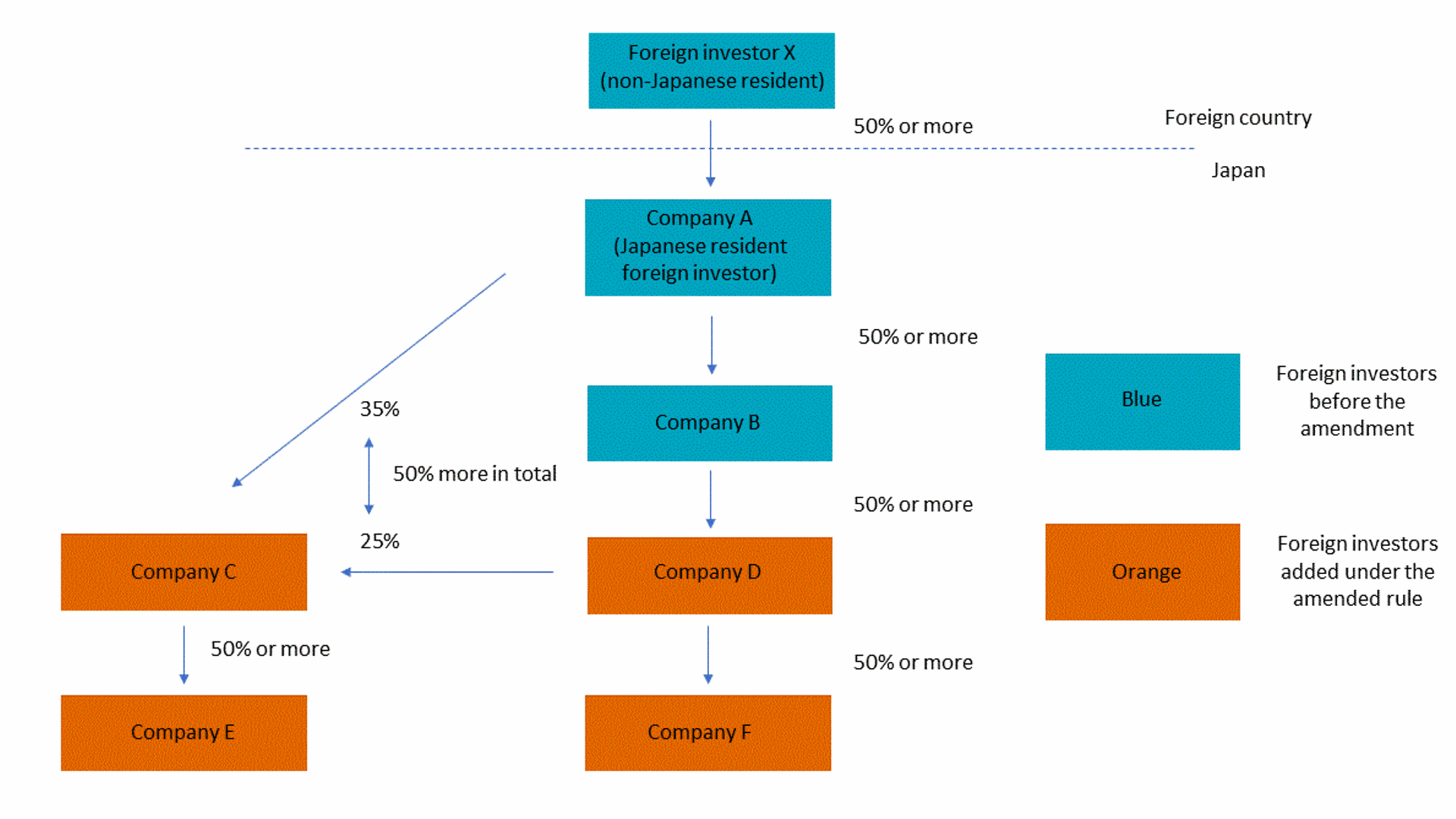 Definition of “Foreign Investor”: Using the below illustration, under the amended rule, all companies that own 50% or more of voting shares of Company A and/or Company A’s subsidiary companies, are regarded as foreign investors. The scope of “subsidiary companies” corresponds to the definition under Japanʼs Companies Act.