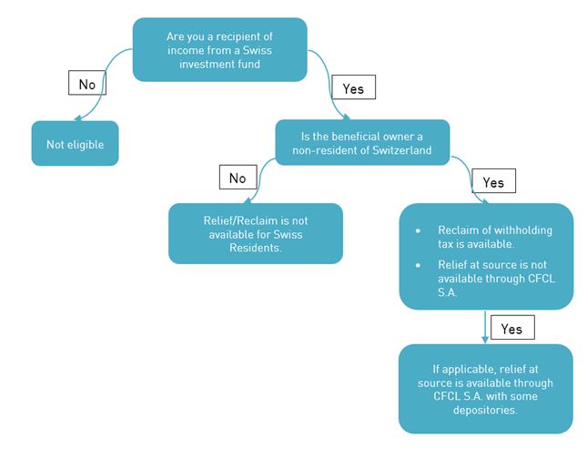 If applicable, Relief at source from withholding tax on income payments from Swiss investment funds is available through Clearstream Fund Centre with some Depositories. In case of Tax Reclaim availability Clearstream will notify its clients via Swift message qualifier WTRC.