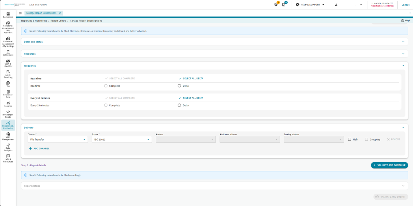 Subscription to the new report formats for Xact File Transfer can be accessed in Xact Web Portal in the Create report subscription screen under Reporting & Monitoring / Report Centre / Manage Report Subscriptions. After a report type, and delivery parameters have been selected, selecting “File Transfer” under Channel and “ISO 20022” under Format in the Delivery section will create an ISO 20022 report delivered via Xact File Transfer.