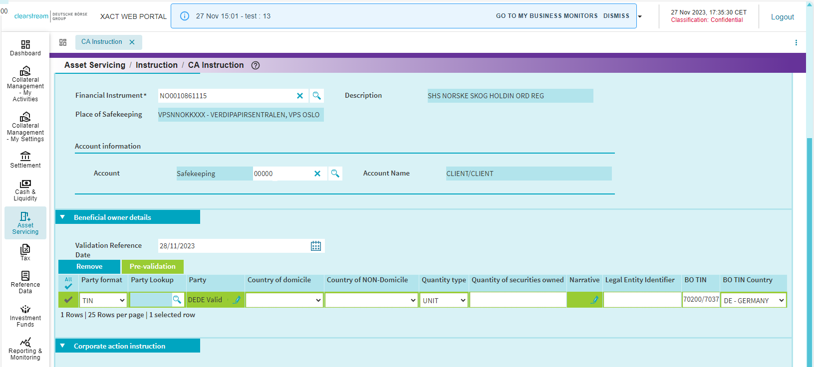 A new possibility to run preliminary certification checks on selected Beneficial Owners will be introduced. It will be found under Asset Servicing / Instruction / CA Instruction / Create CA Instruction / Beneficial owner details / Add: