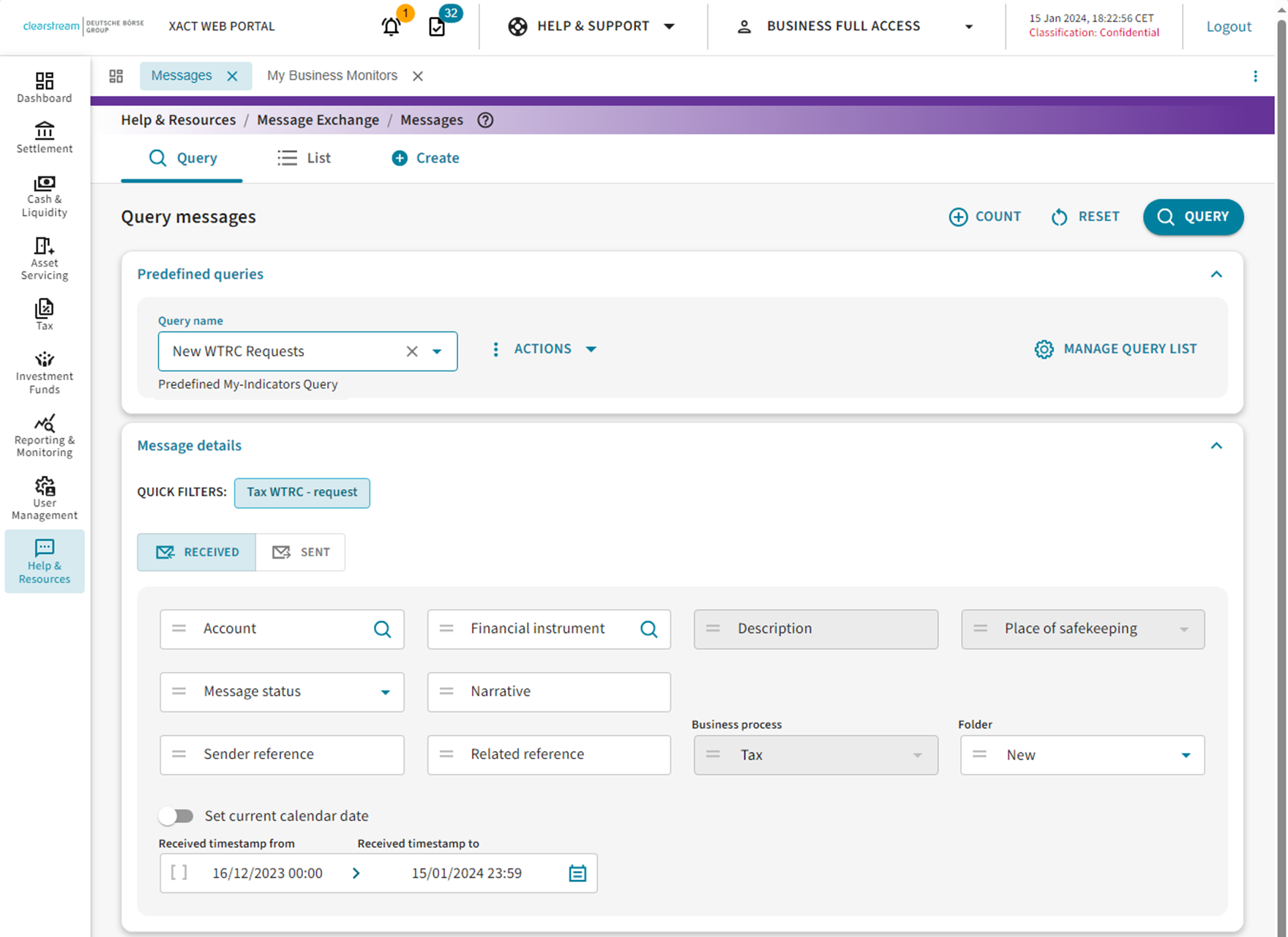 - Clicking on the widget will indicate the number of requests that can be filtered by account and take the user directly to the Message Exchange2 domain where a predefined query "New WTRC Requests" will be added with the following filters: