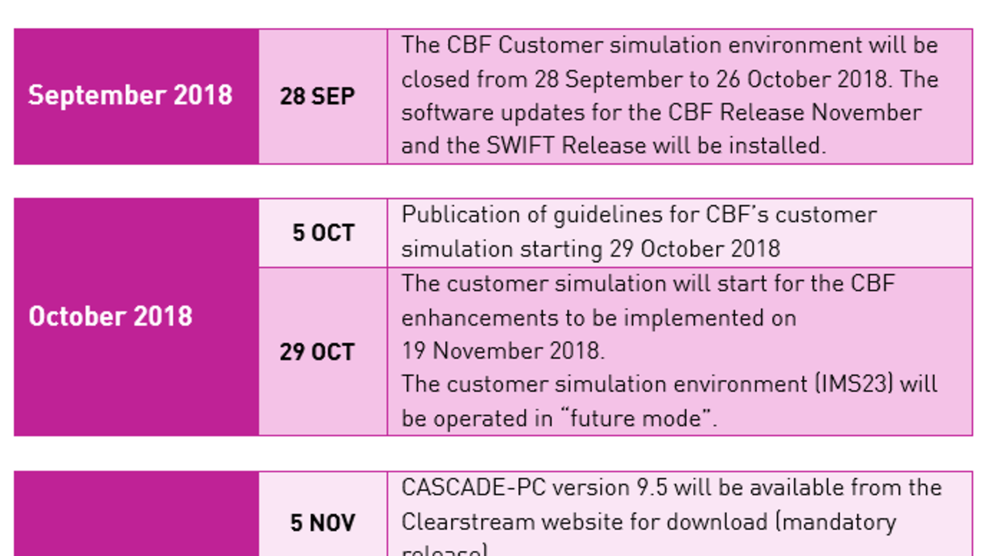 Clearstream Banking AG, Frankfurt1 informs customers about the content of the November Releases that will deliver CBF and TARGET2-Securities (T2S) functional enhancements. The implementation is scheduled for