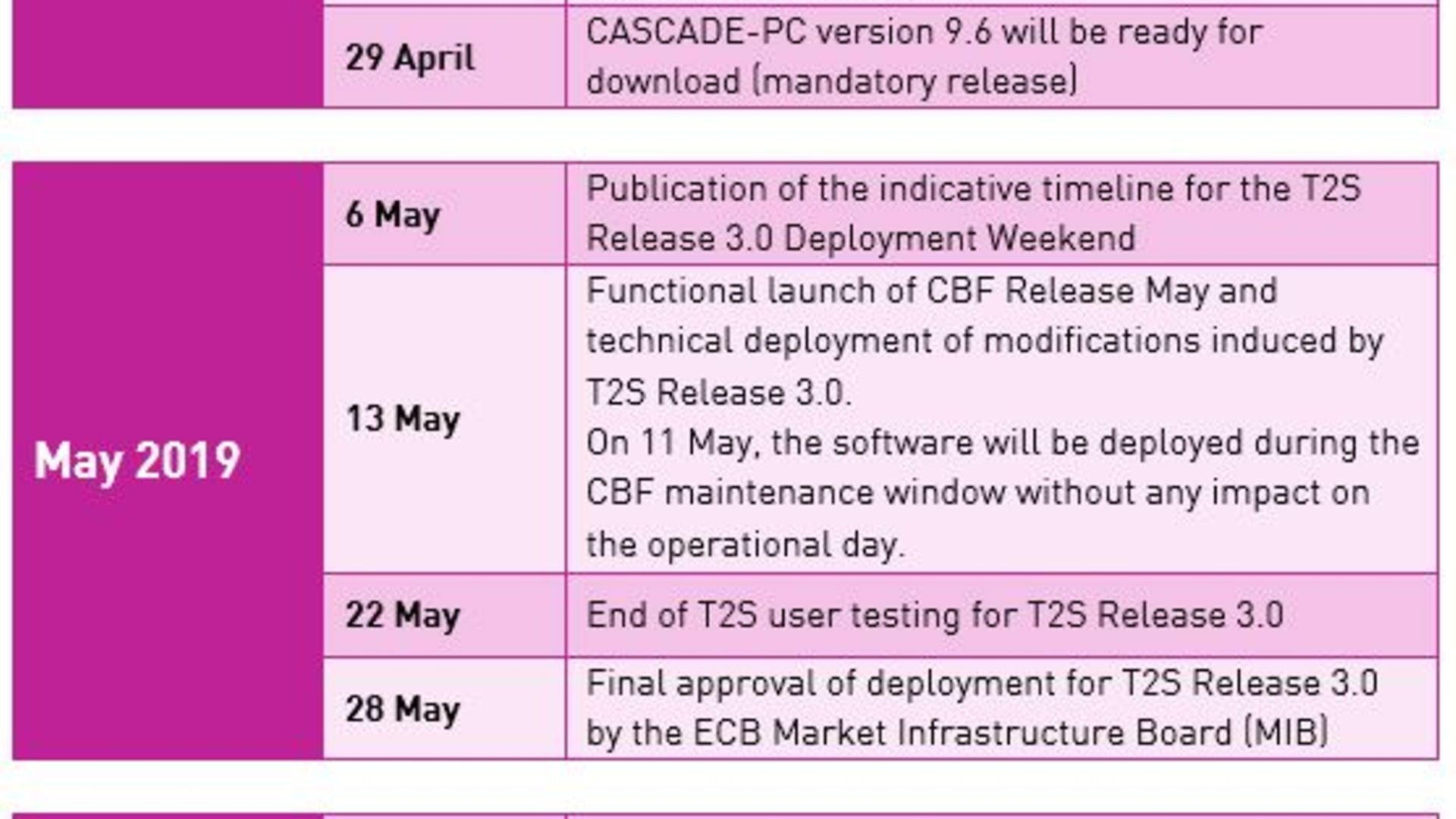The schedule below indicates the milestones related to the upcoming CBF Release May 2019 and T2S Release 3.0.