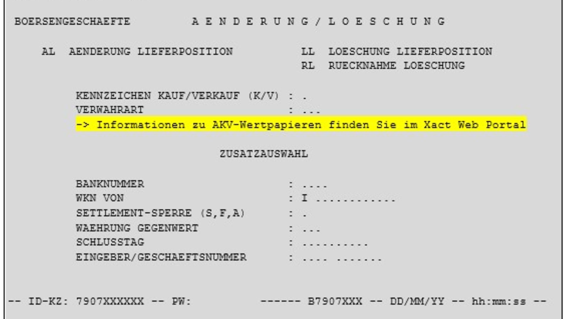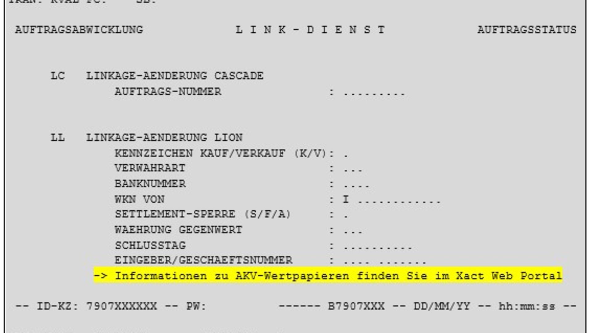 The text “Informationen zu AKV-Wertpapieren finden Sie im Xact Web Portal” will be displayed for the following LION Host transactions (TRAN):