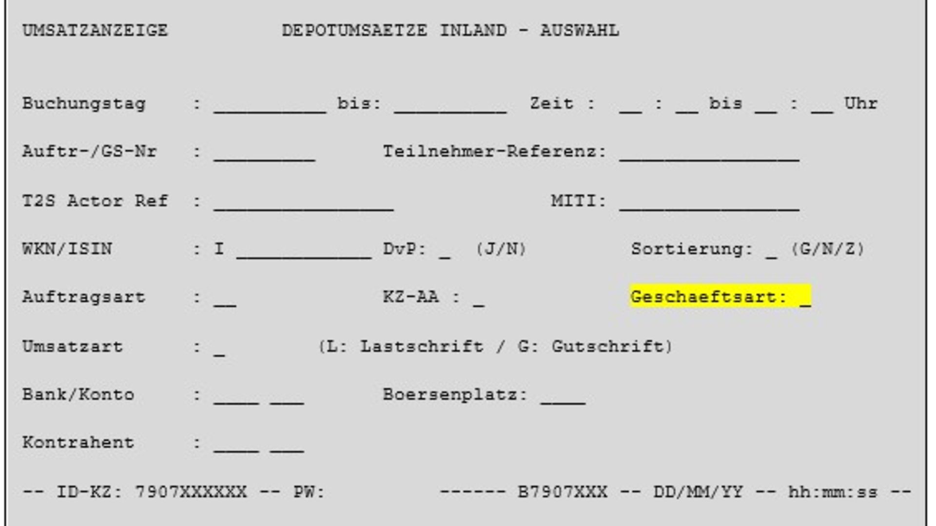 In order to retrieve information, it is mandatory to fill the Lastschrift-Bank (debitor) or the Gutschrift-Bank (creditor). Optionally, both fields can be filled.. The selection can be further defined by using a settlement status flag matched (“M”), open (offen; “O”) or incorrect (fehlerhaft, “F”). In addition, in the new field “Geschäftsart” a value can be entered to enrich the selection criteria.