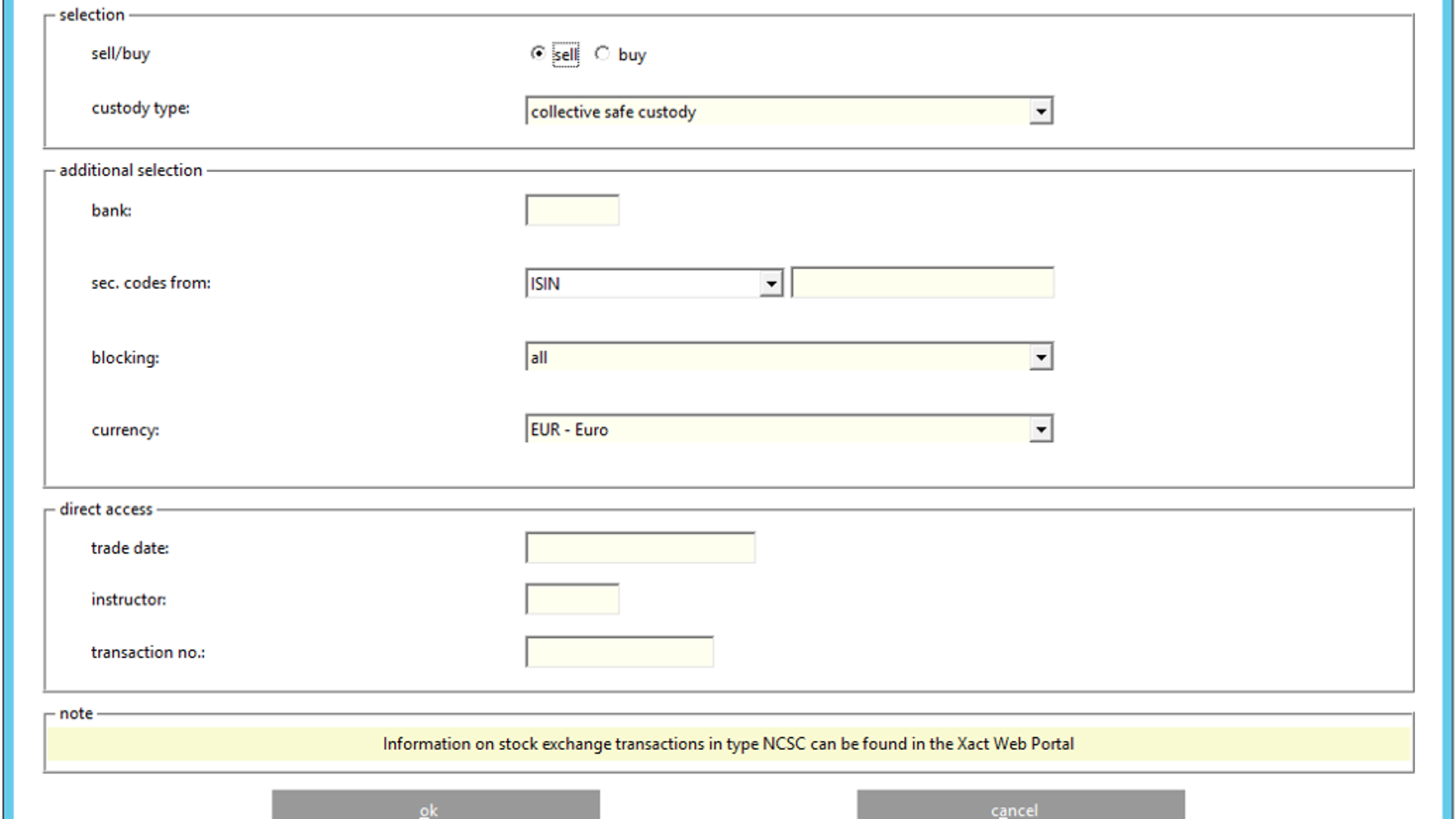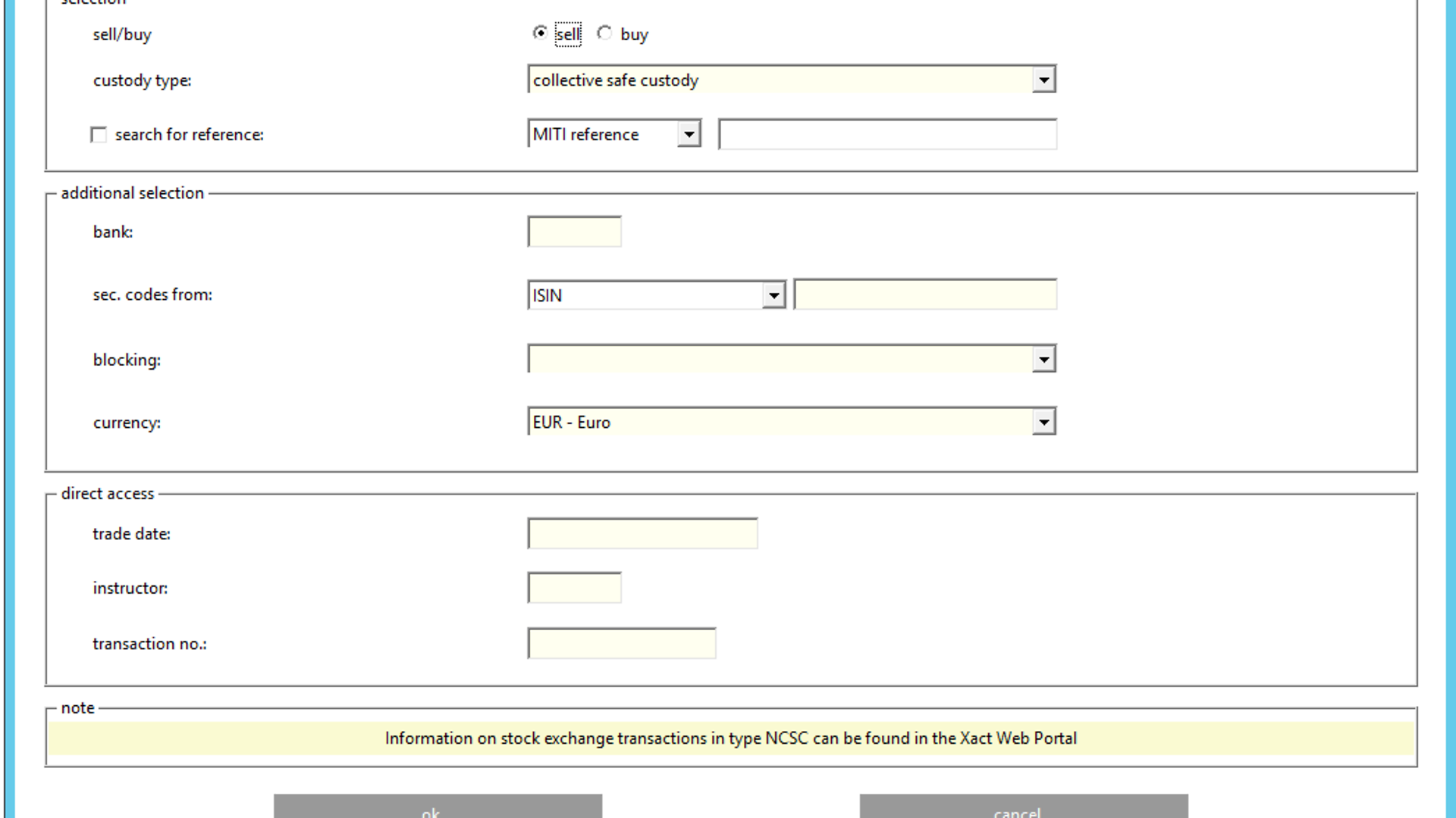 Customers using the ISIN as selection criterion need to consider, that based on the existing LION selection process, data is displayed for this and subsequent ISINs in alphabetical order. That is, if an ISIN in custody type NCSC is entered, there might be no information given for this ISIN. However, LION may display data for further instruction(s) in custody type CSC and NCSC-T. In this case, it cannot be concluded that there is no pending SE instruction in NCSC.