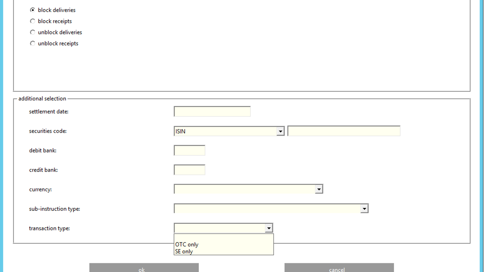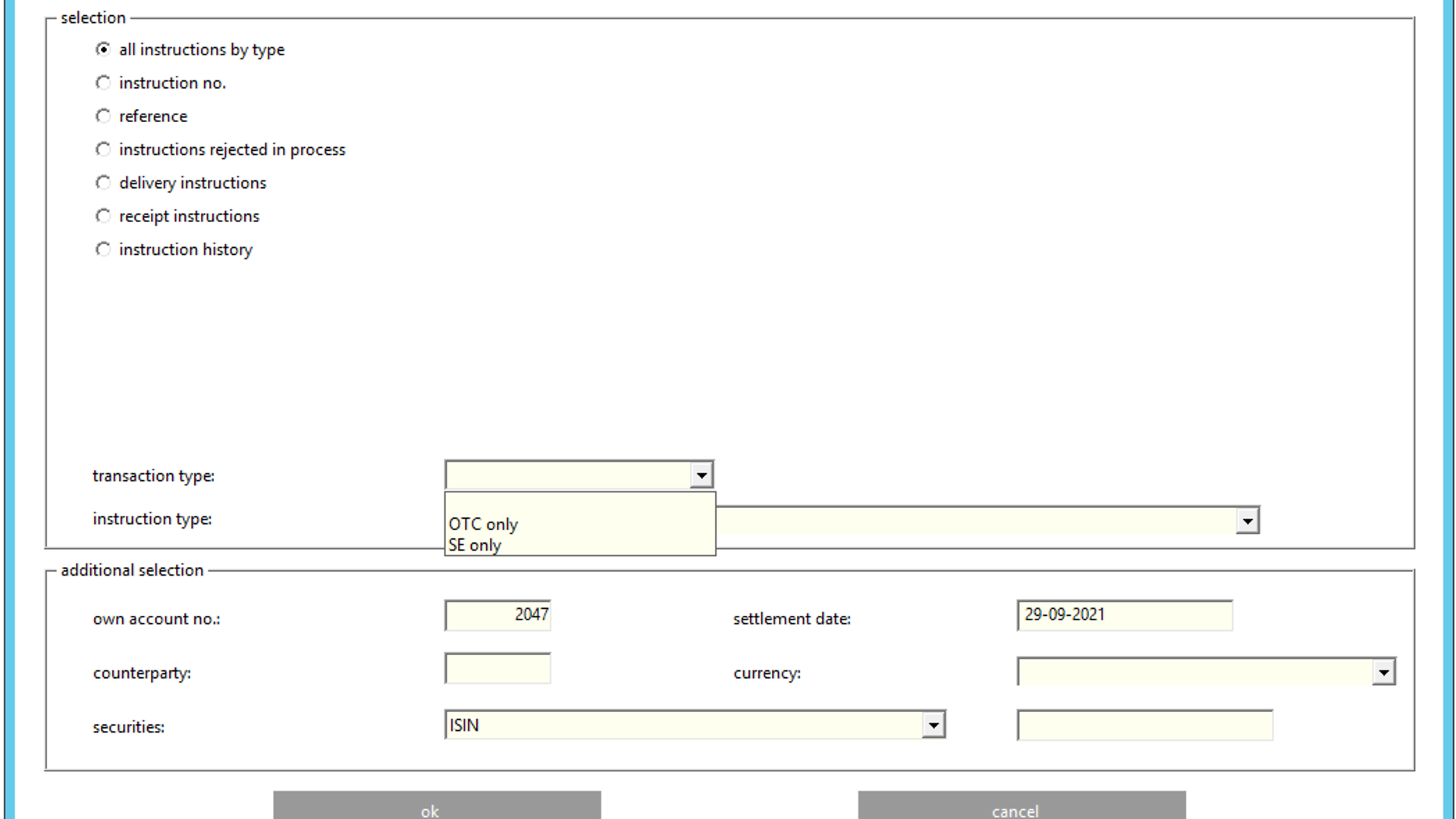 Blank | The pending delivery or receipt instructions for the selected debitor or / and creditor are displayed. | 22 November 2021 OTC instructions only; 13 June 2022 |