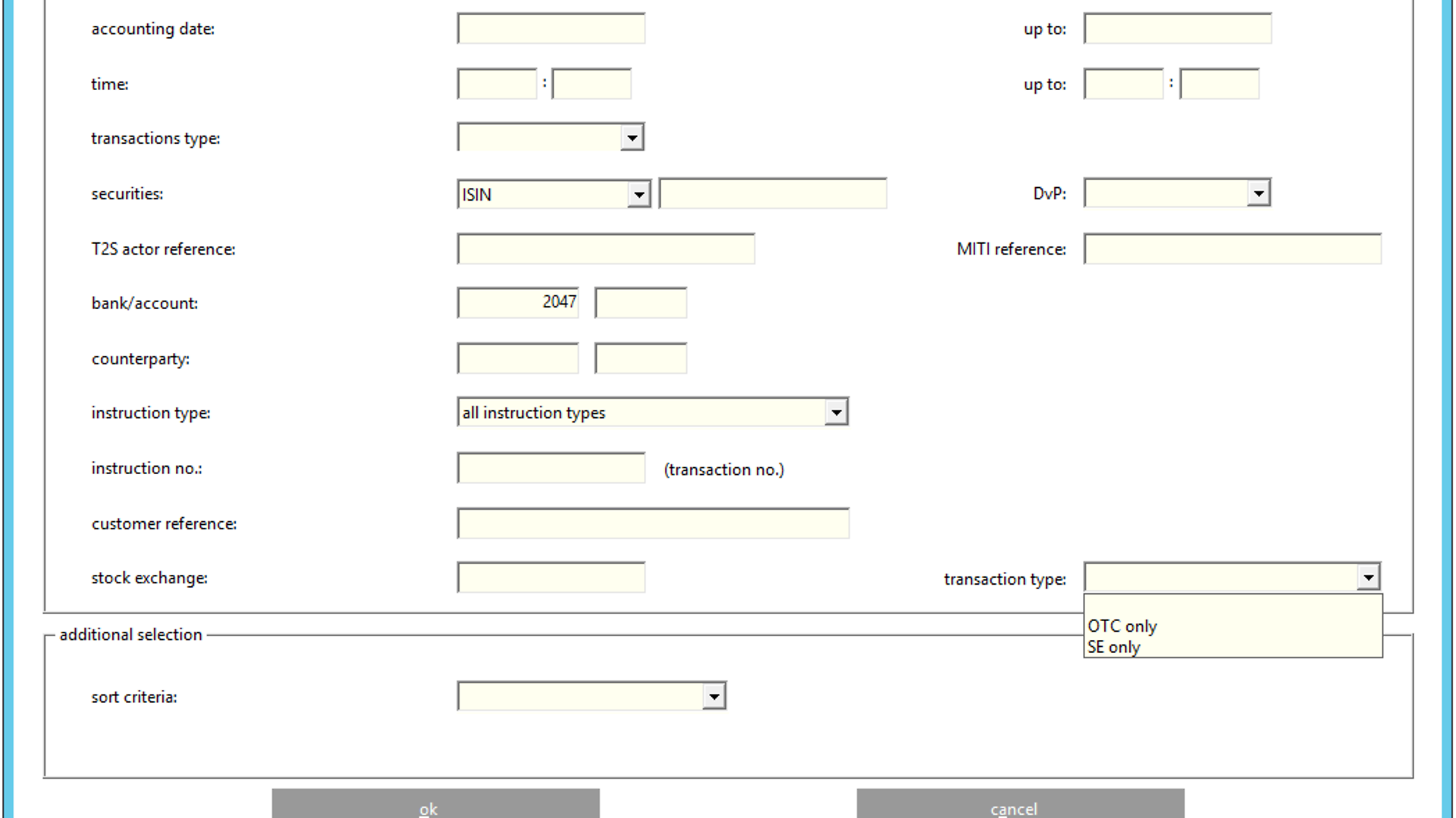 Besides the mandatory entry of the “Auftragsart”, the Lastschrift-Bank (debitor) and / or the Gutschrift-Bank (creditor) can be filled. In addition, in the new field “Geschäftsart” a value can be entered to enrich the selection criteria.