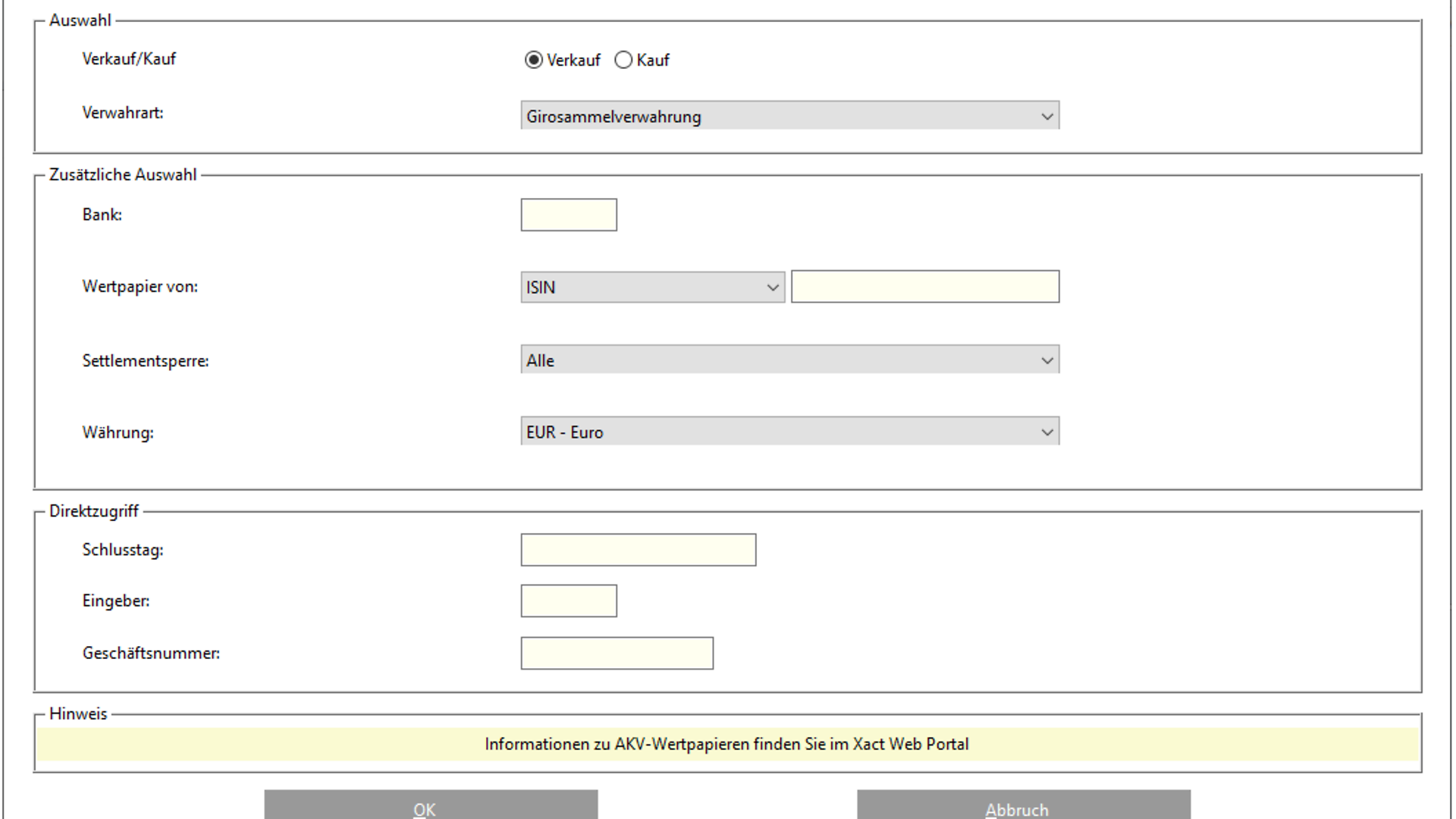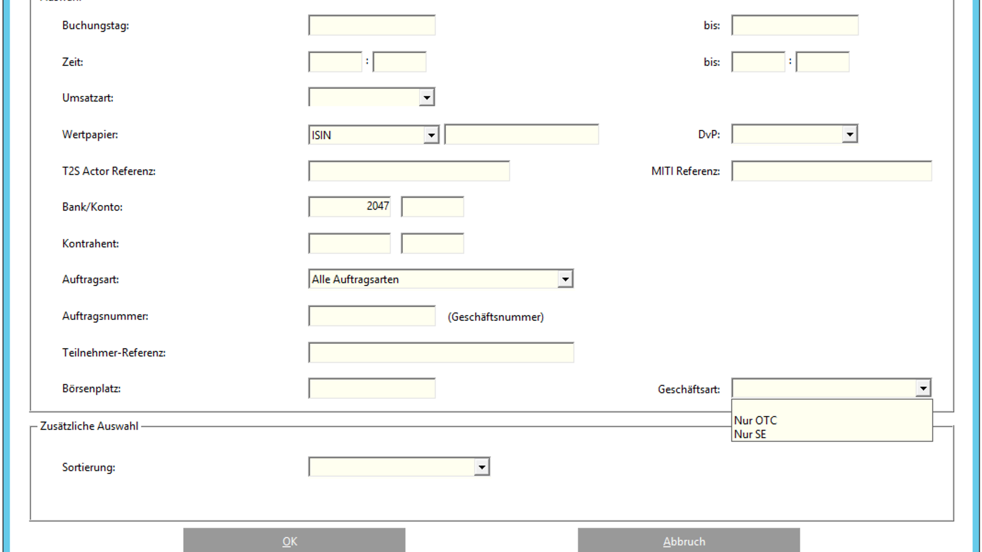 Neben der Pflichteingabe der „Auftragsart“ kann die Lastschrift-Bank und / oder die Gutschrift-Bank ausgefüllt werden. Zusätzlich kann im neuen Feld „Geschäftsart“ ein Wert eingegeben werden, um die Auswahl zu verfeinern.