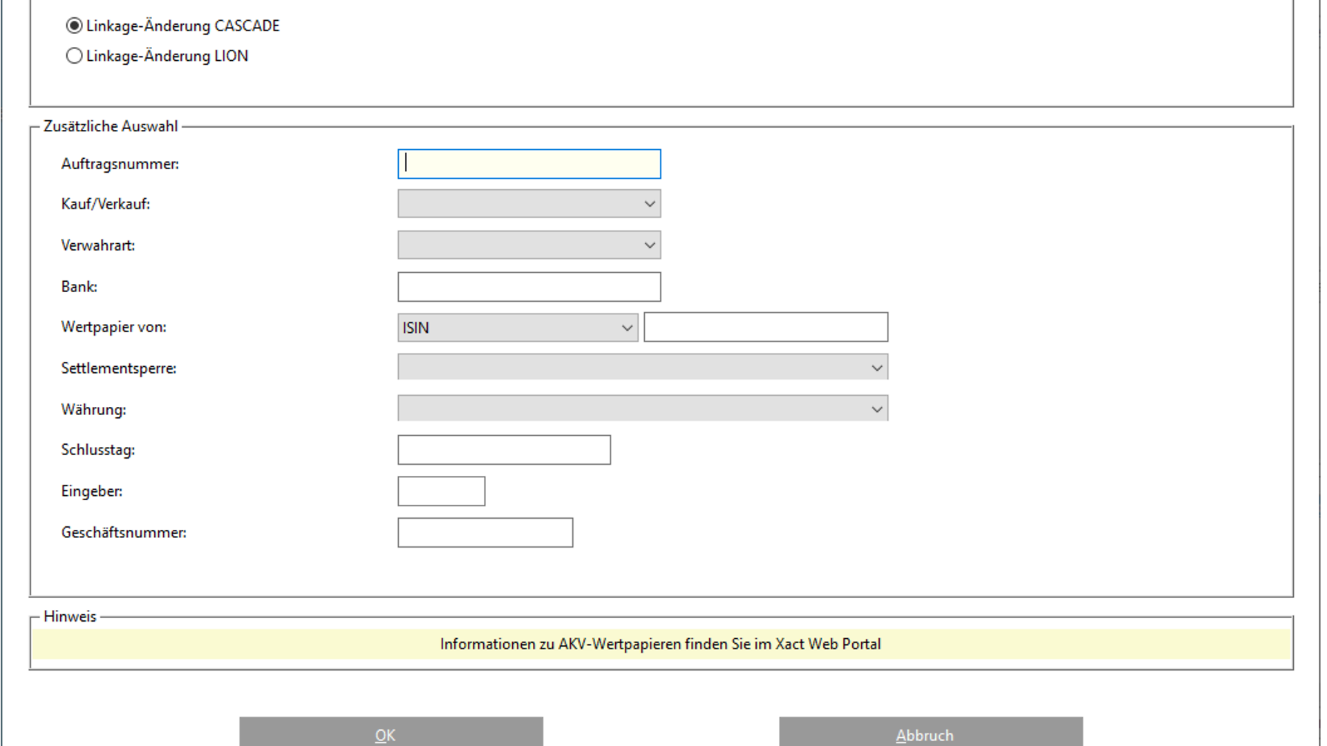 Auf den CASCADE-LION-Bildschirmen werden die Kunden darüber informiert, dass Börseninstruktionen in der Verwahrart NCSC ausschließlich über das Xact Web Portal abgerufen werden können.