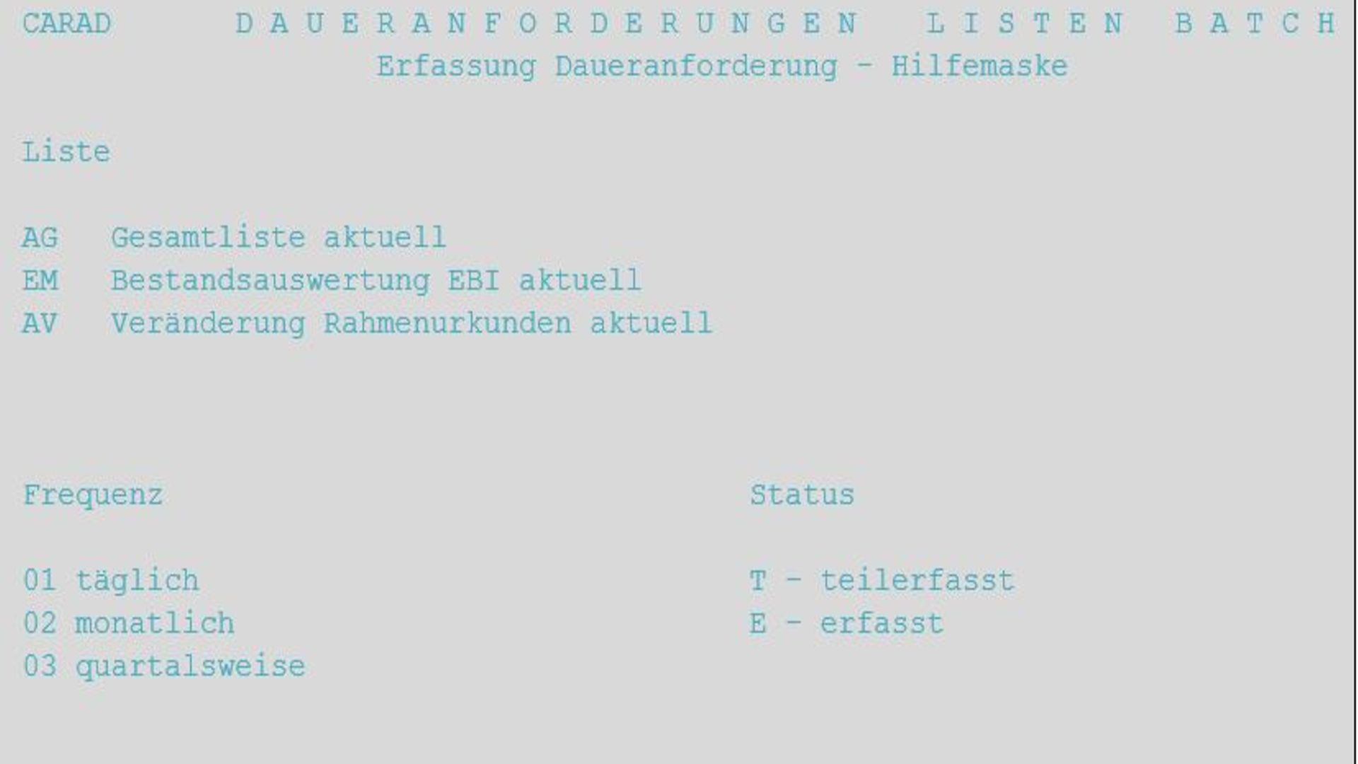 The "Bank:" field is pre-filled with the master account of the logged-in CARAD user (corresponding to digits 1-4 in the "ID-KZ:" field). The "Frequenz:" (see codes 01-03 above) and "Gültig von:" fields can only be filled in for the function codes ID and AD. The PF1 button opens the following help menu: