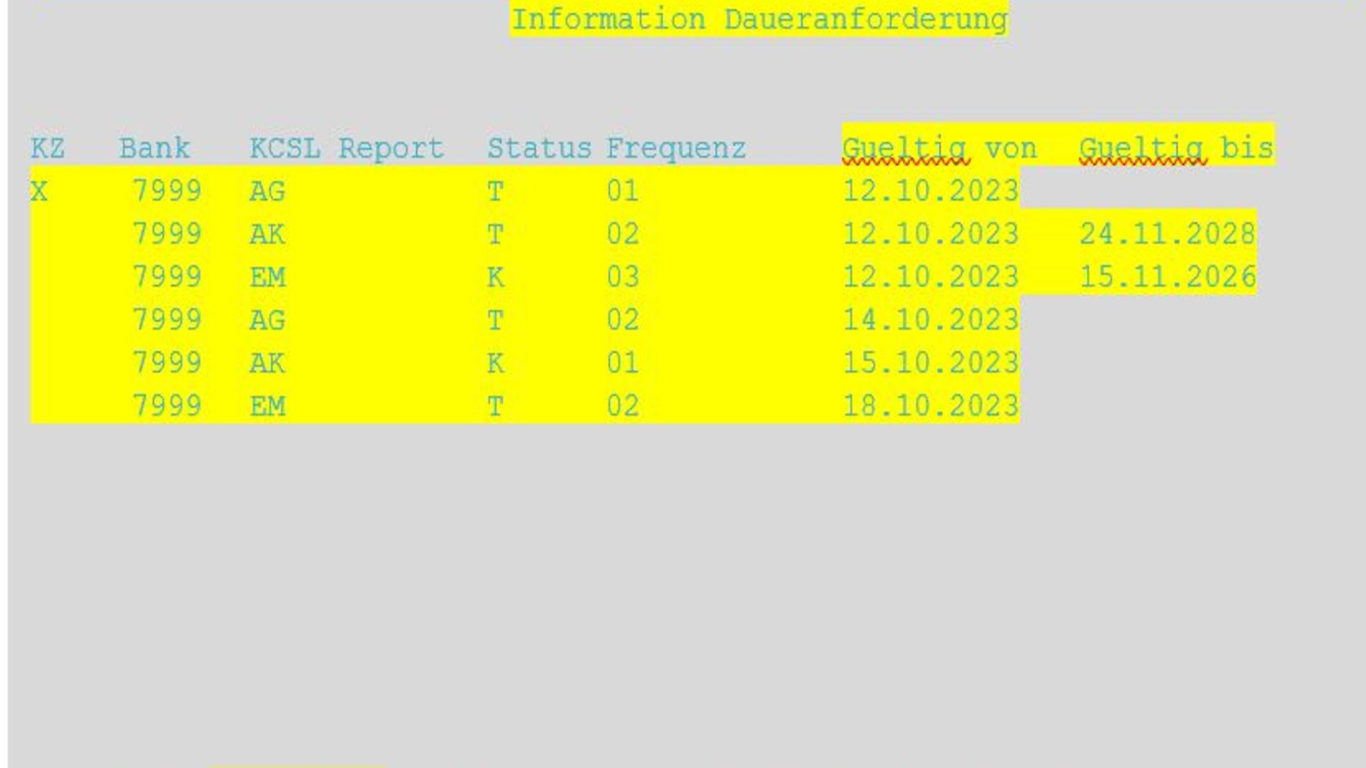 The content and format of the lists will not change compared to the one-time lists that are currently available. The lists can be generated for all T2S settlement days (details of the "T2S Holiday Calendar are available under T2S and T2 downtimes on public holidays). Clients can set up standing orders in the enhanced CARAD menu KCSL under the functional codes: