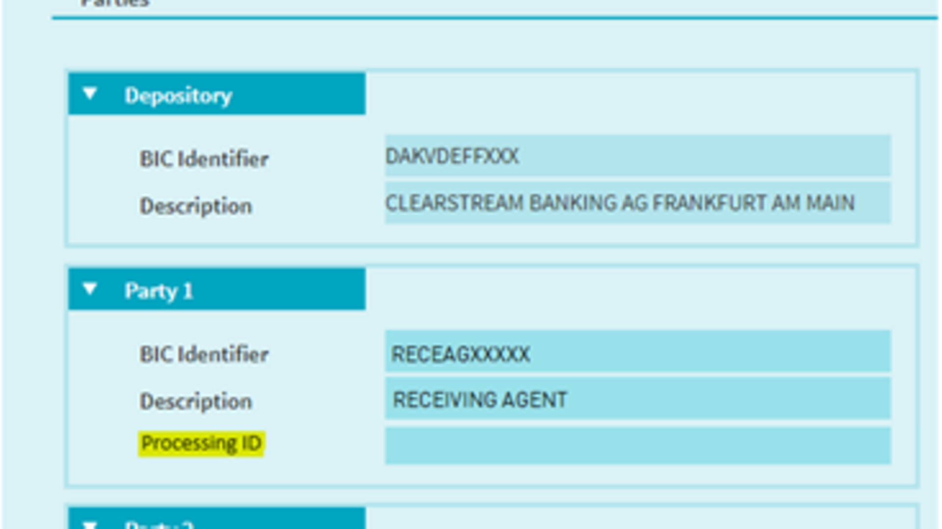 Like this, it will be possible in the OneClearstream and in the T2S reporting to find the self-assigned order reference of the instructions sent as ICP3. The aim is to offer a seamless reconciliation of the settlement feedback for instructions set up in T2S by CBF (DAKVDEFFXXX as "Instructing Party") and hence with a CBF reference. These are the following types of instructions: