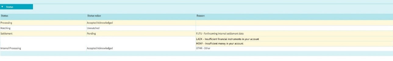 If the T2S 20022 message (sese.024) contains several pending or failing reasons, then all these reasons will be listed as repetitions of the status sequence in the corresponding MT548. The Xact Web Portal will display all the reasons as follows: