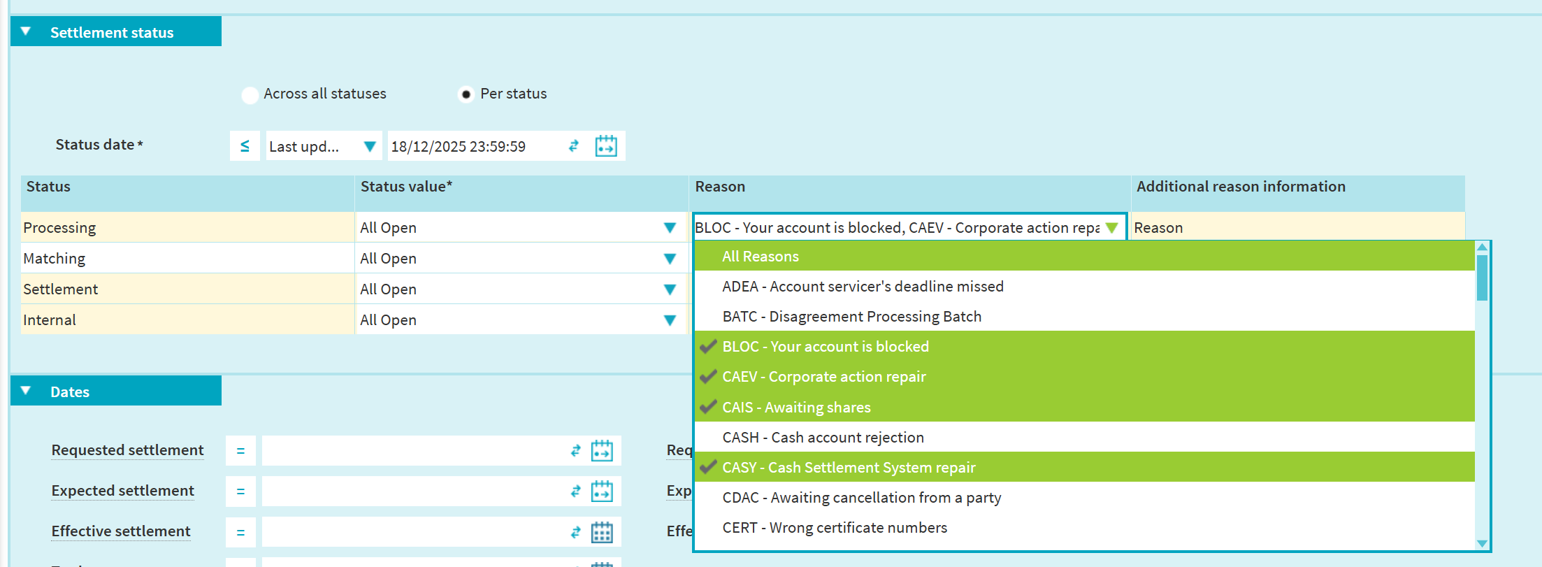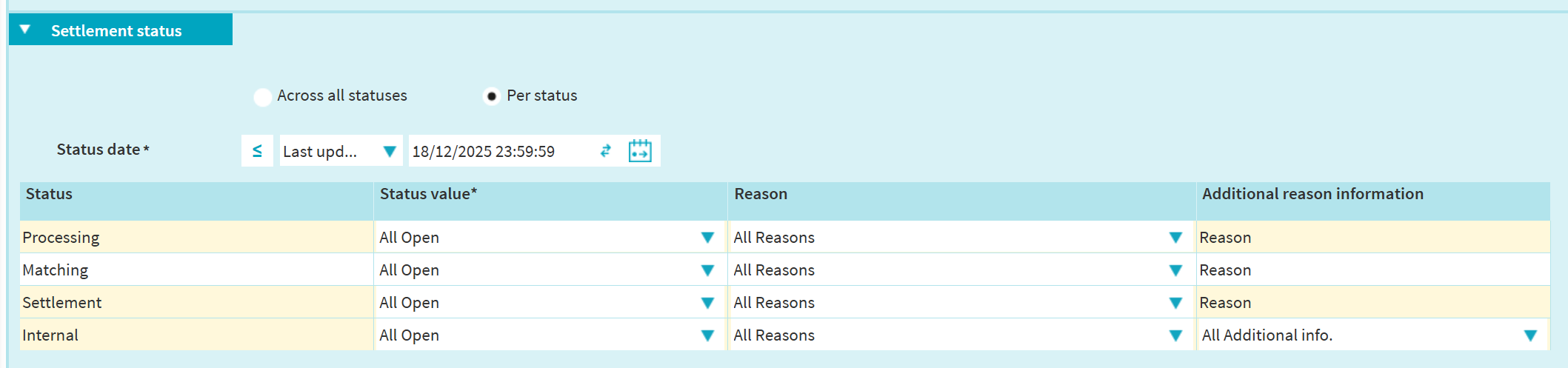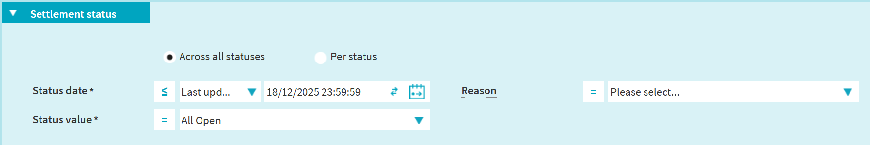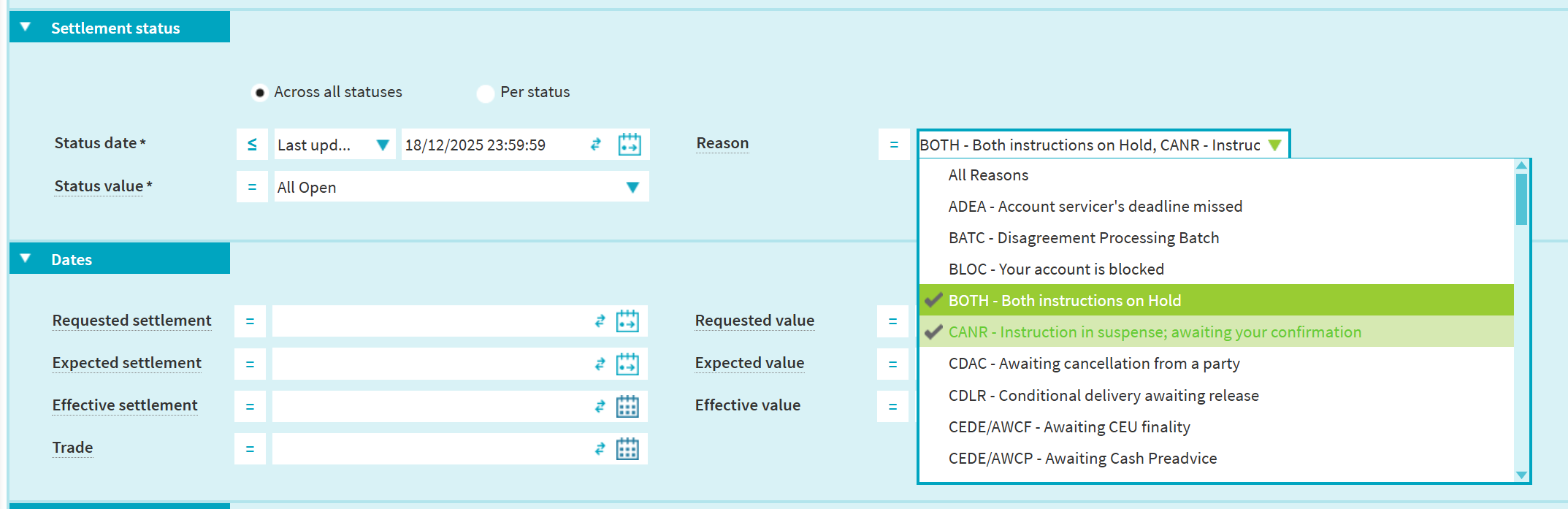 Option 2 (only available for open instructions): Query per settlement status category