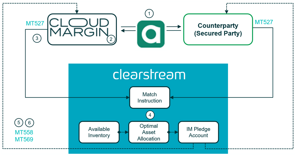 Clearstream has pre-established connectivity solutions with a number of third party vendors, such as Cloudmargin to facilitate E2E Triparty messaging flows.