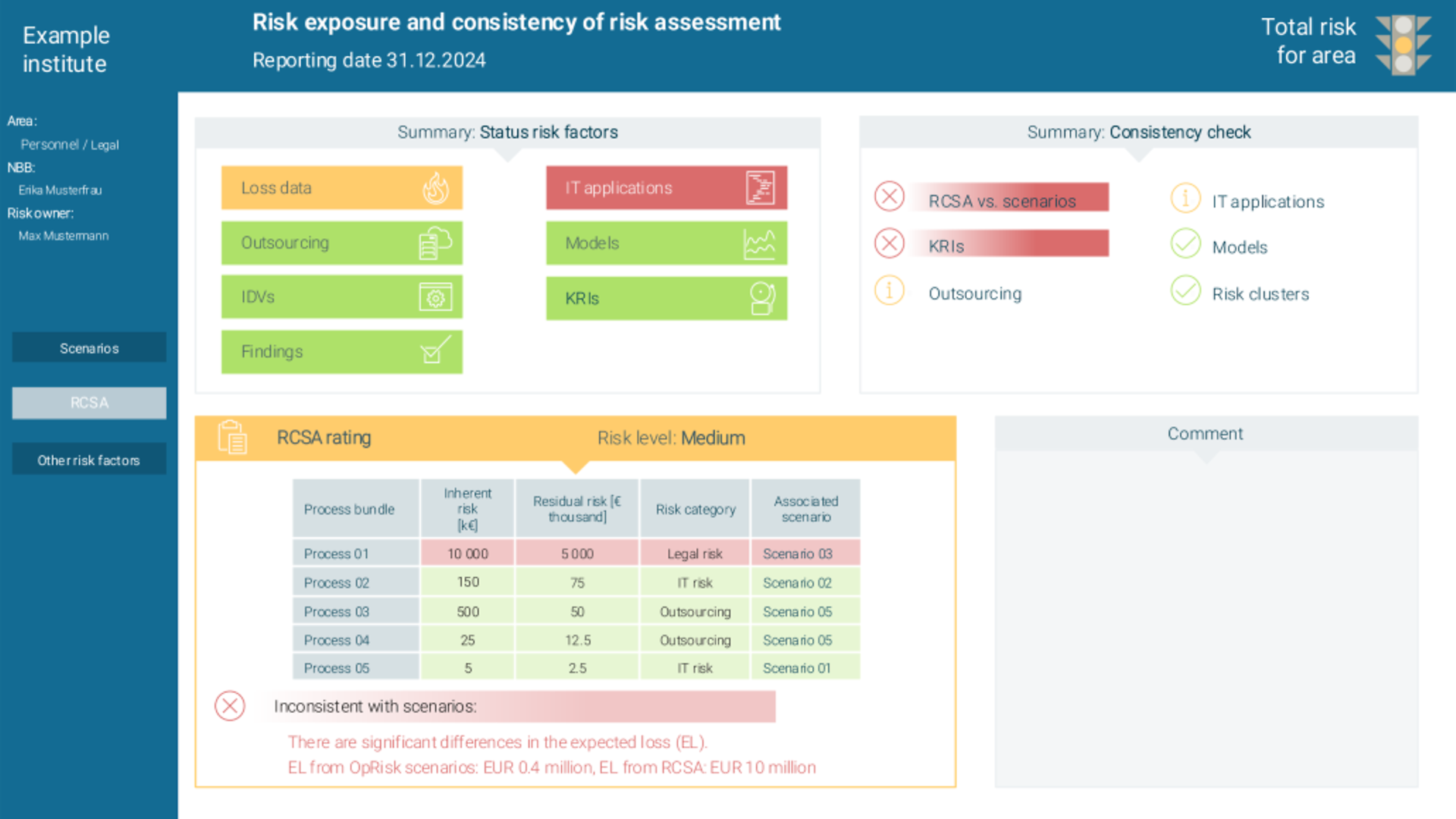 Efficiency: A cohesive presentation of the entire risk profil of a department or a process bundle on a few pages enables more efficient processing both for the business units and for NFR risk controlling.