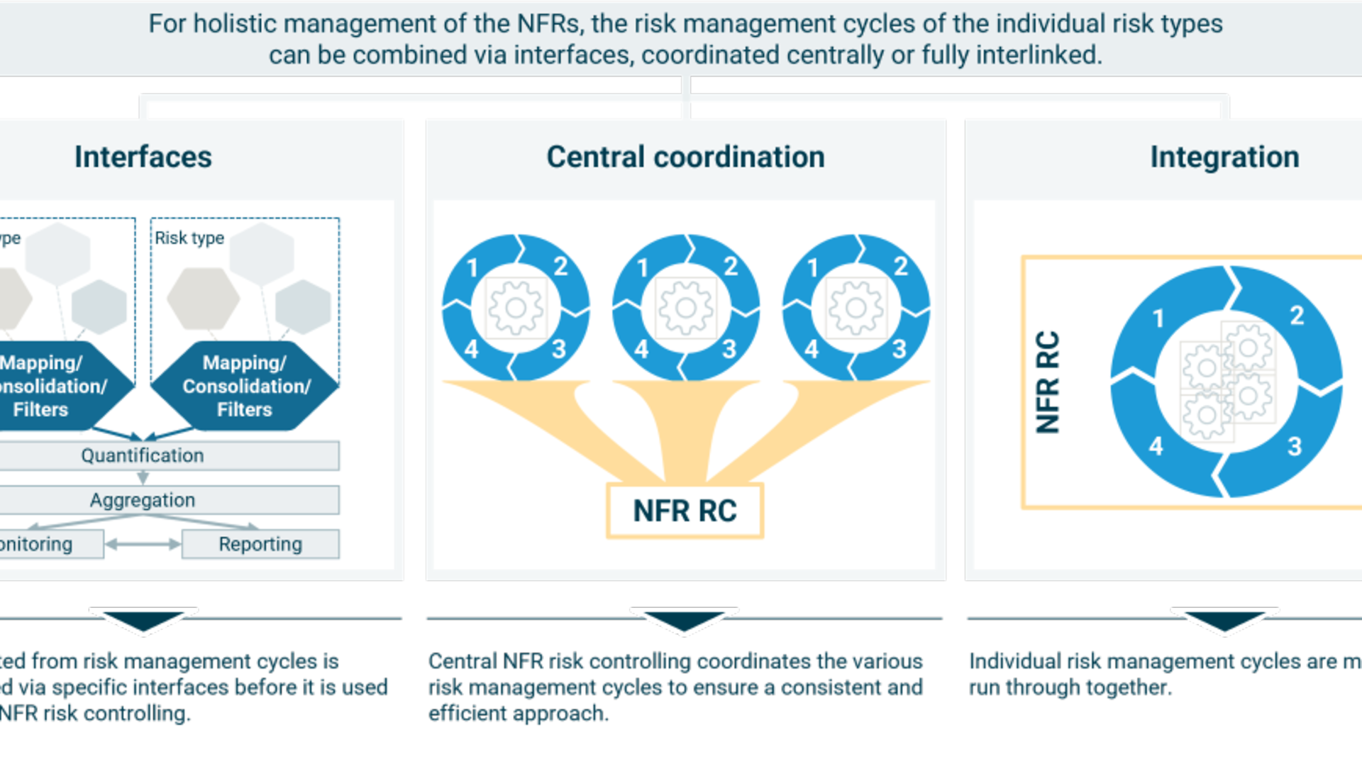 Depending on the scope of the respective risk management cycle, the organizational embedding of risk management and the size of the institution, there are different approaches as to how an efficient connection via defined interfaces, central coordination or complete integration can be implemented (see Fig. 1).