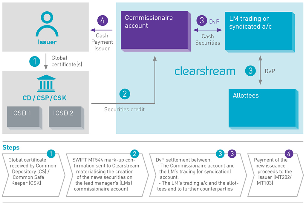 The new syndicated securities distribution service will allow the deposit of the global certificate by the Common Depository/Common Service Provider for a credit of securities on the “commissionaire” account against the assurance that: