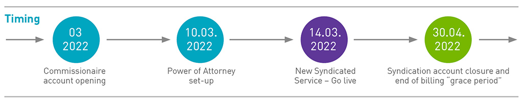 To ensure that Clearstream executes the payment to the issuer immediately after securities have been distributed, Clearstream will require that lead managers systematically mention in the narrative field :72: – of their cash instruction(s) MT202 / MT103 the ISIN code that will be settled via DvP. This ISIN code to be systematically mentioned in the payment instruction is the one mentioned in the delivery instruction (MT543 type) under field :35B:. - Upon participant’s confirmation, syndication account will be closed on 30 April 2022