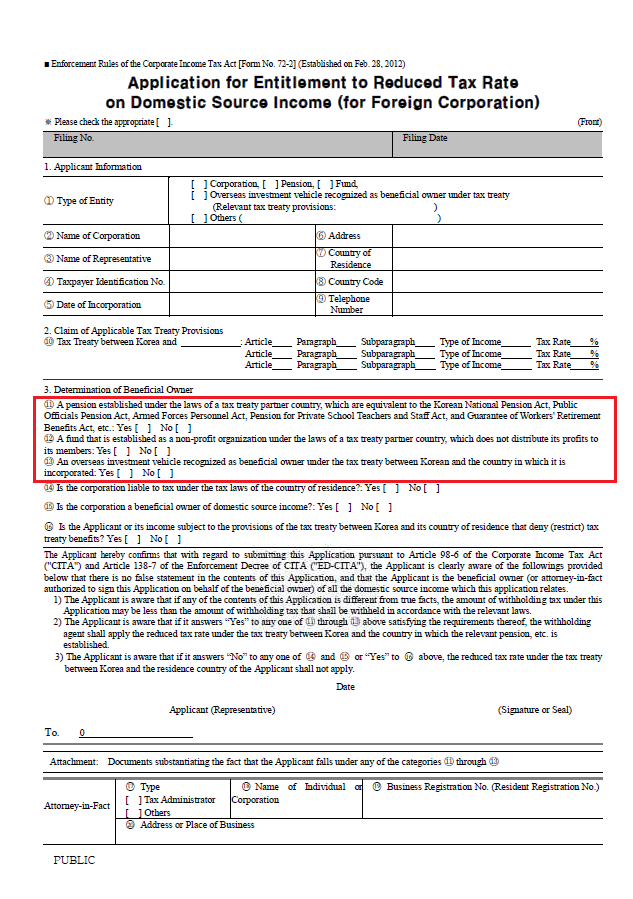 If the Applicant is a manufacturing company, bank, financial company, or other incorporated as a company who is the actual beneficial owner of the Korean income, then in general the Applicant would select “corporation” as beneficial owner on the Application for Entitlement to Reduced Tax Rate on Domestic Source Income (for Foreign Corporation) [Form No. 72-2], item 1