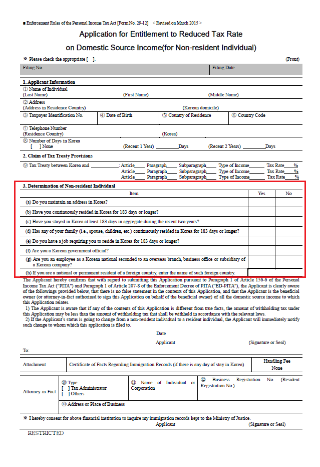 If the Applicant answers “Yes” to any one of those criteria, for example, the Items (a) through (g) on Form for Individual No.3 Determination of Non-resident Individual, item 3 the Applicant shall be treated as a Korean resident subject to maximum default tax rate unless there is a special reason to be treated as otherwise. Whether or not the applicant is a foreign national or permanent resident of a foreign country shall not be considered in determining the individual’s resident or non-resident status.
