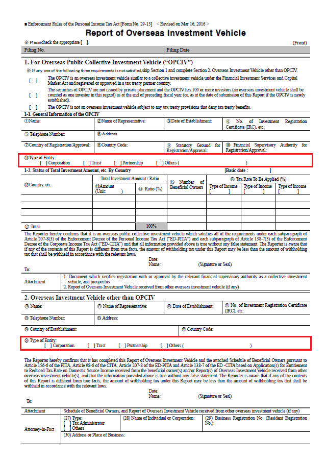 Foreign investors which fall under the above definition must arrange to complete the Report of Overseas Investment Vehicle as opposed to the Application for Entitlement to Reduced Tax Rate on Domestic Source Income (for Foreign Corporation) [Form No. 72-2]. In case the fund is a corporate type fund, then please choose “corporation” and in case the fund is a trust type fund, please choose “trust” on Report of Overseas Investment Vehicle (OIV), items 11 and 26