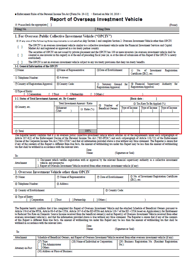 The tax form will need to be submitted where it classifies the beneficial owners by each country at the time of submitting the Report. The Korea Tax Authority has explained that the composition of unit holders of a public fund can change on a daily basis, therefore, in principle the report would need to be resubmitted on a daily basis. If, however, it is considerably difficult to resubmit the Report, the Korea Tax Authority explained that the report can be prepared and be submitted by using the information as at the end of the preceding half-year from which the Report is submitted (the Report can be submitted once every half-year) or the status of investors can be based on any date going backwards within 6 calendar months from the date of income payment date.