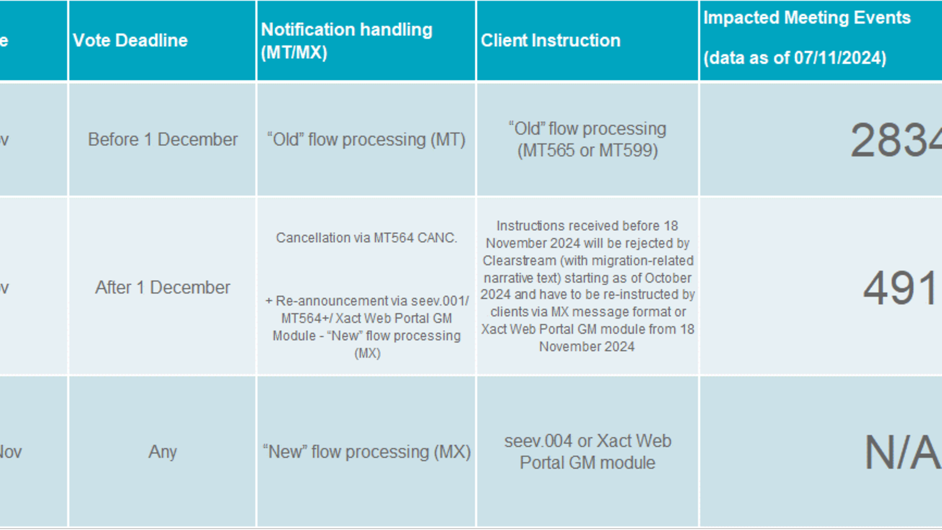 Clearstream Banking1 informiert seine Kunden, dass im Rahmen der Implementierung des ISO 20022-Nachrichtenformats für Hauptversammlungen (HV) die Vorläufige Liste der zu migrierenden Events zum Download auf der General Meetings Service Webseite bereitsteht.