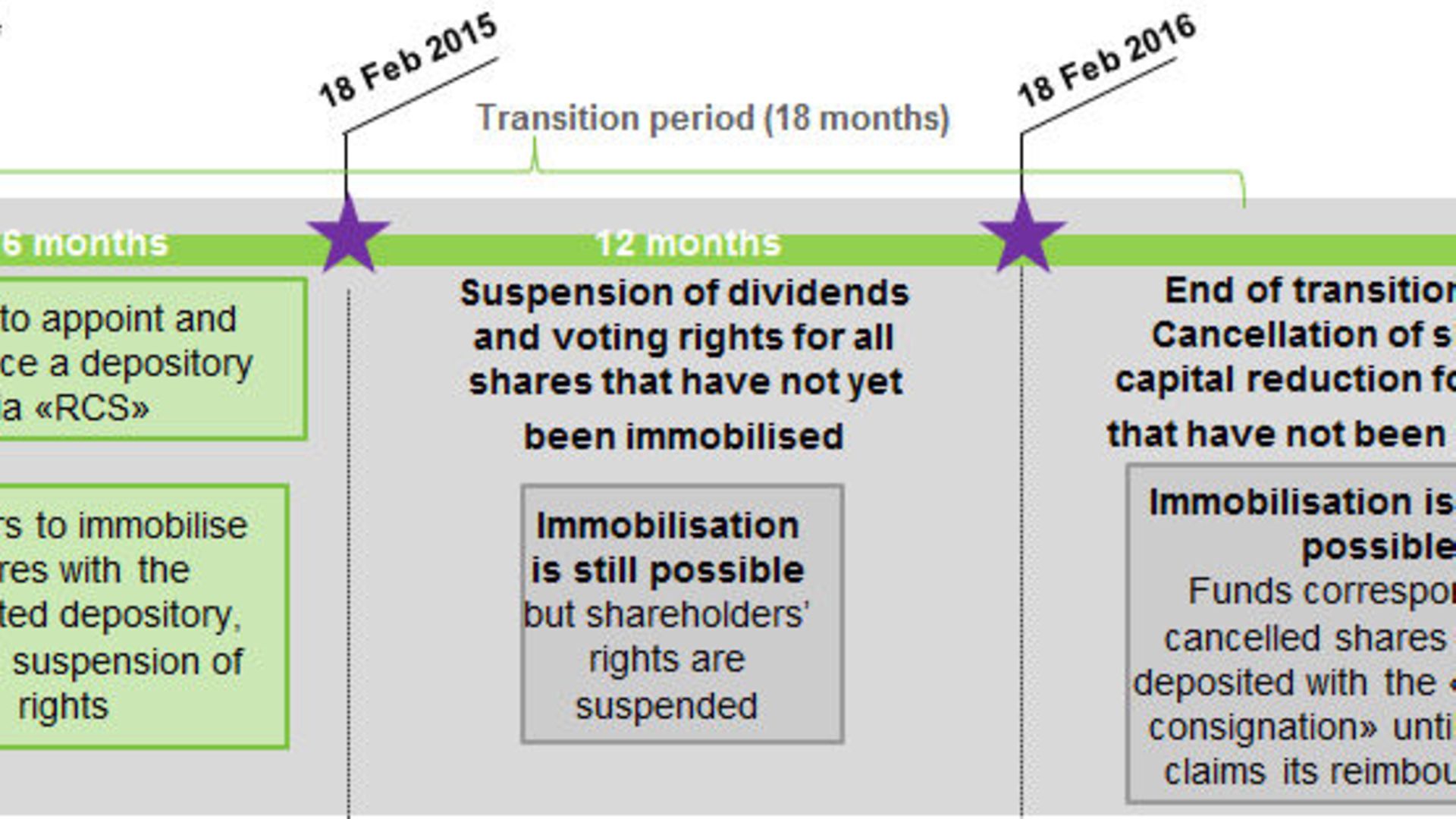 - If, six months after the entry into force of the Law, the aforementioned bearer shares/units are still not immobilised, voting rights related to them will be frozen and dividend payments will be deferred until the shares/units are effectively immobilised.
