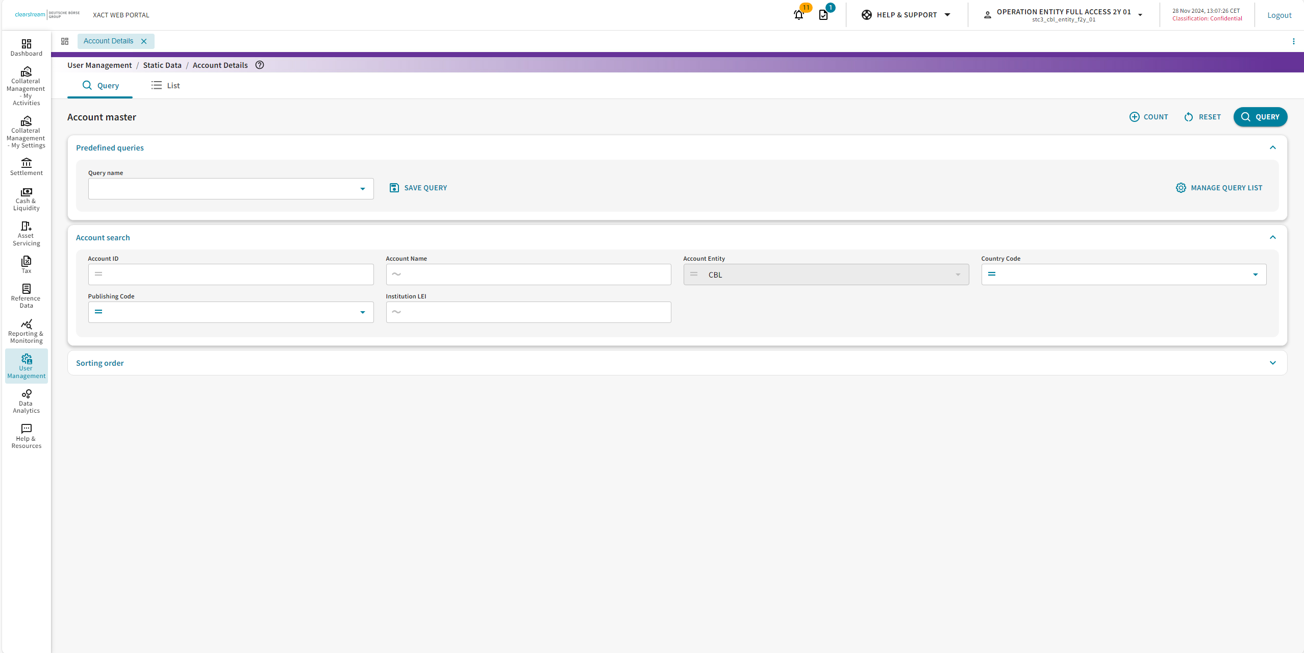 Accounts can be queried in the Query view based on the Account ID, Account Entity or name, as well as the Institution LEI, Country Code and Publishing Code.