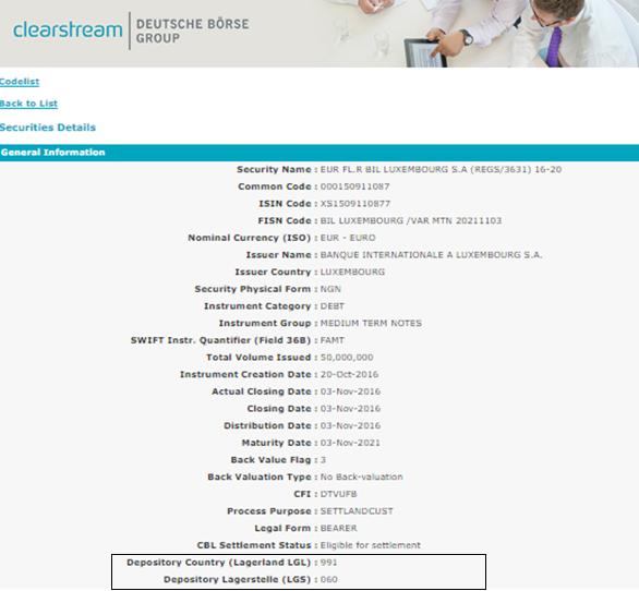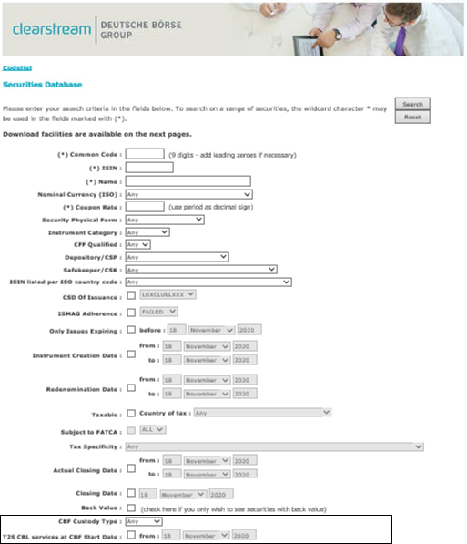 The Codelist application is Clearstream Banking’s online access point to databases of cash correspondents, depositories, securities, Euro fixing rates and issuer International Securities Market Advisory Group (ISMAG) adherence. The Securities Database that is part of the Codelist is only accessible if you are logged in as a “Premium User”.