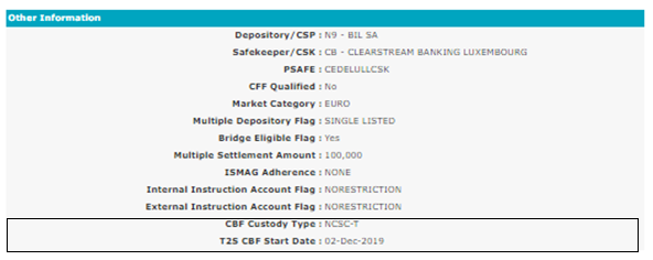 - Both the “CBF Custody Type” (such as NCSC-T) and “T2S CBF Start Date” (corresponding to the LMP activation date) are reflected under the “Other Information” section.