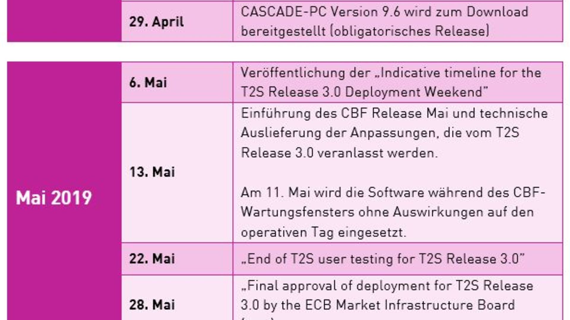 Basierend auf dem angekündigten Release Plan wird CBF im Mai 2019 Erweiterungen für CBF Dienstleistungen zur Verfügung stellen. Mit dem Release wird die bestehende CBF Funktionalität aktualisiert und es dient als Vorbereitung für die Implementierung des TARGET2-Securities (T2S) Release 3.0. Weitere Details zum Leistungsumfang des T2S Release 3.0 sind in der Kundenmitteilung D19005 erläutert.