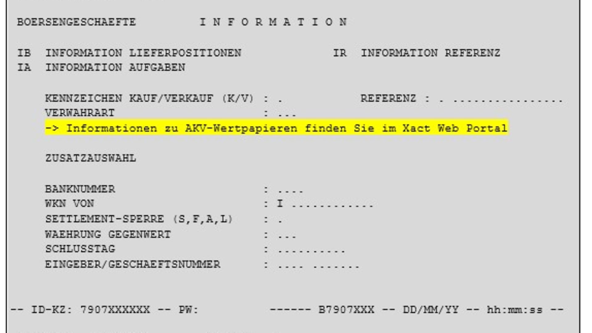 The text “Informationen zu AKV-Wertpapieren finden Sie im Xact Web Portal” will be displayed for the following LION Host transactions (TRAN):