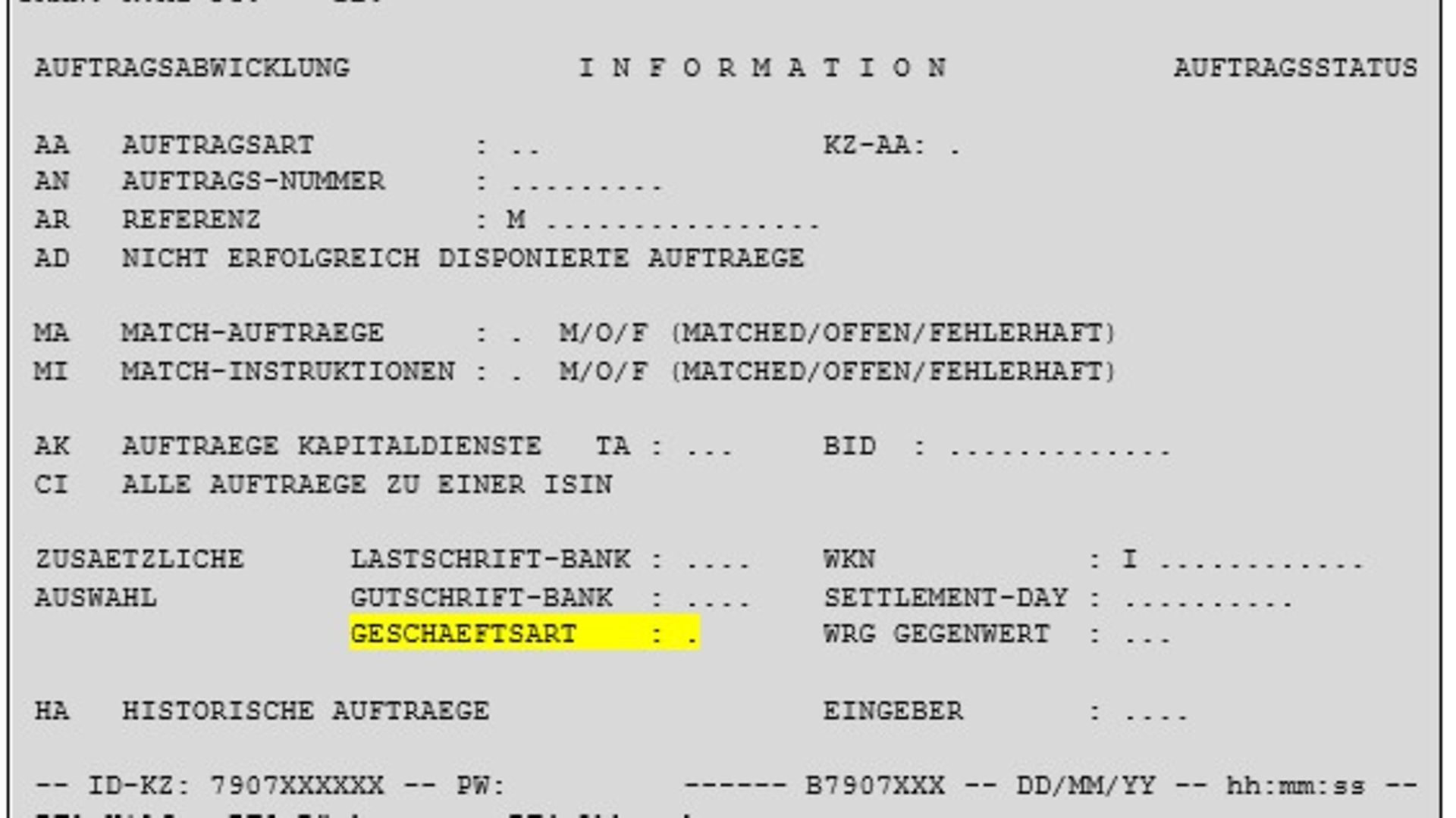 - BLANK = All instruction types being defined by “Auftragsart” and “KZ-AA”;