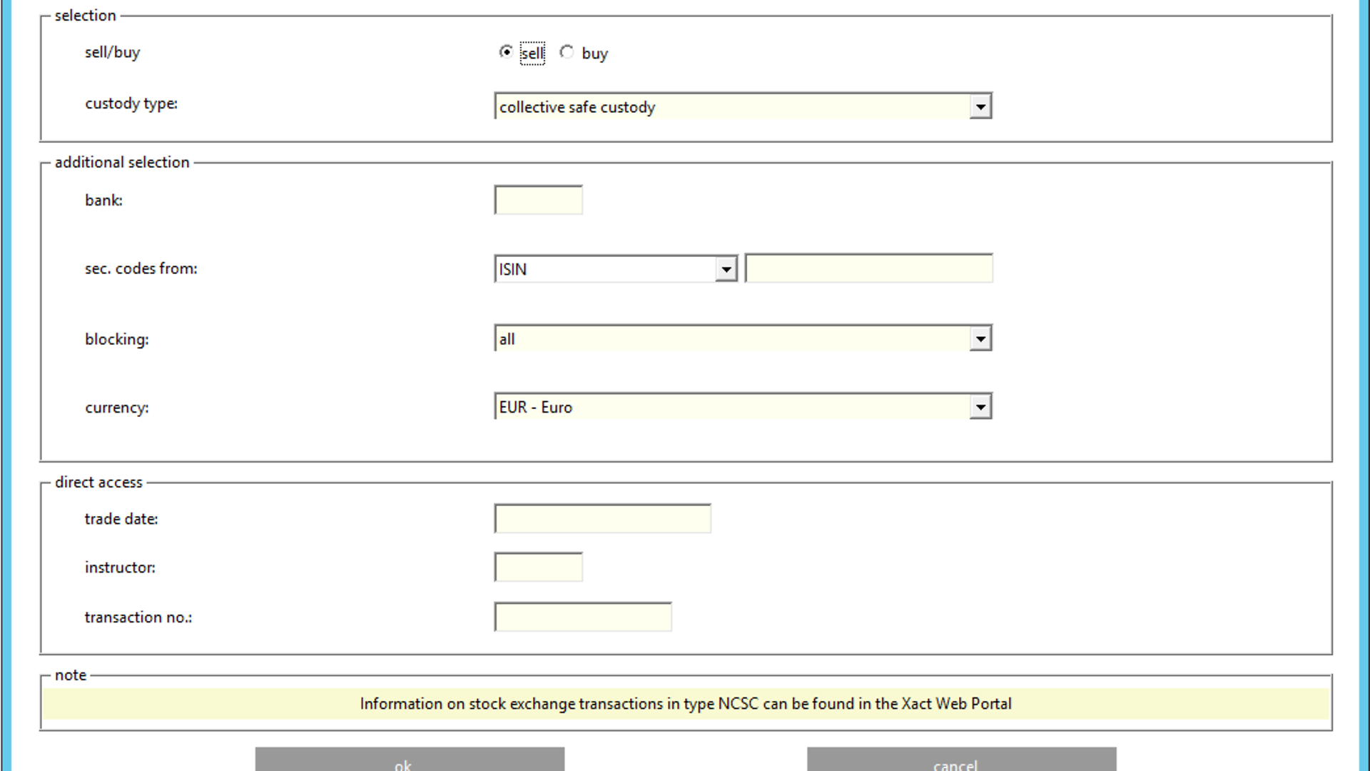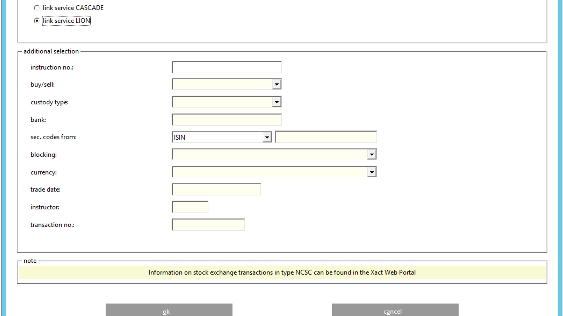 Customers using the ISIN as selection criterion need to consider, that based on the existing LION selection process, data is displayed for this and subsequent ISINs in alphabetical order. That is, if an ISIN in custody type NCSC is entered, there might be no information given for this ISIN. However, LION may display data for further instruction(s) in custody type CSC and NCSC-T. In this case, it cannot be concluded that there is no pending SE instruction in NCSC.