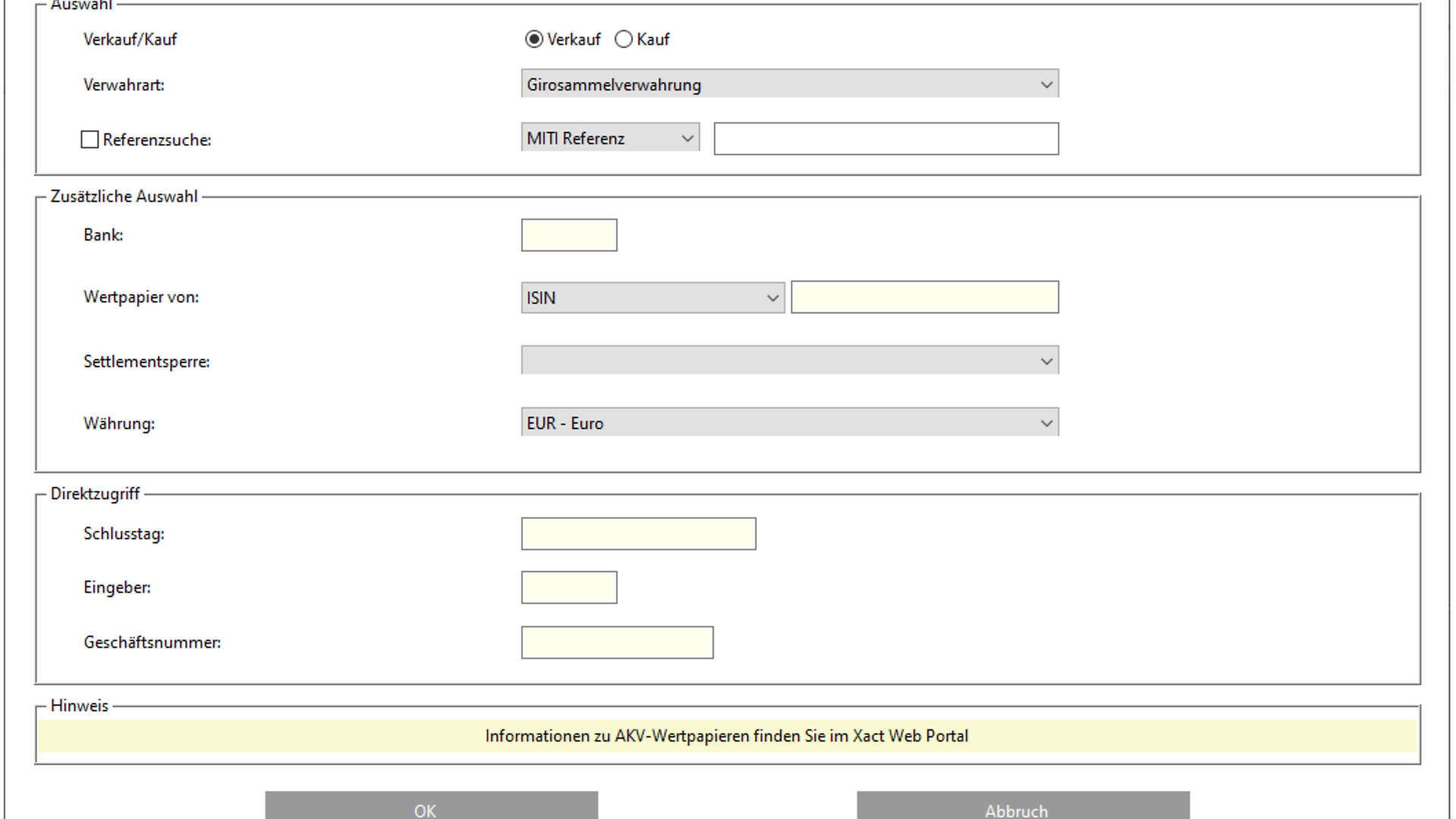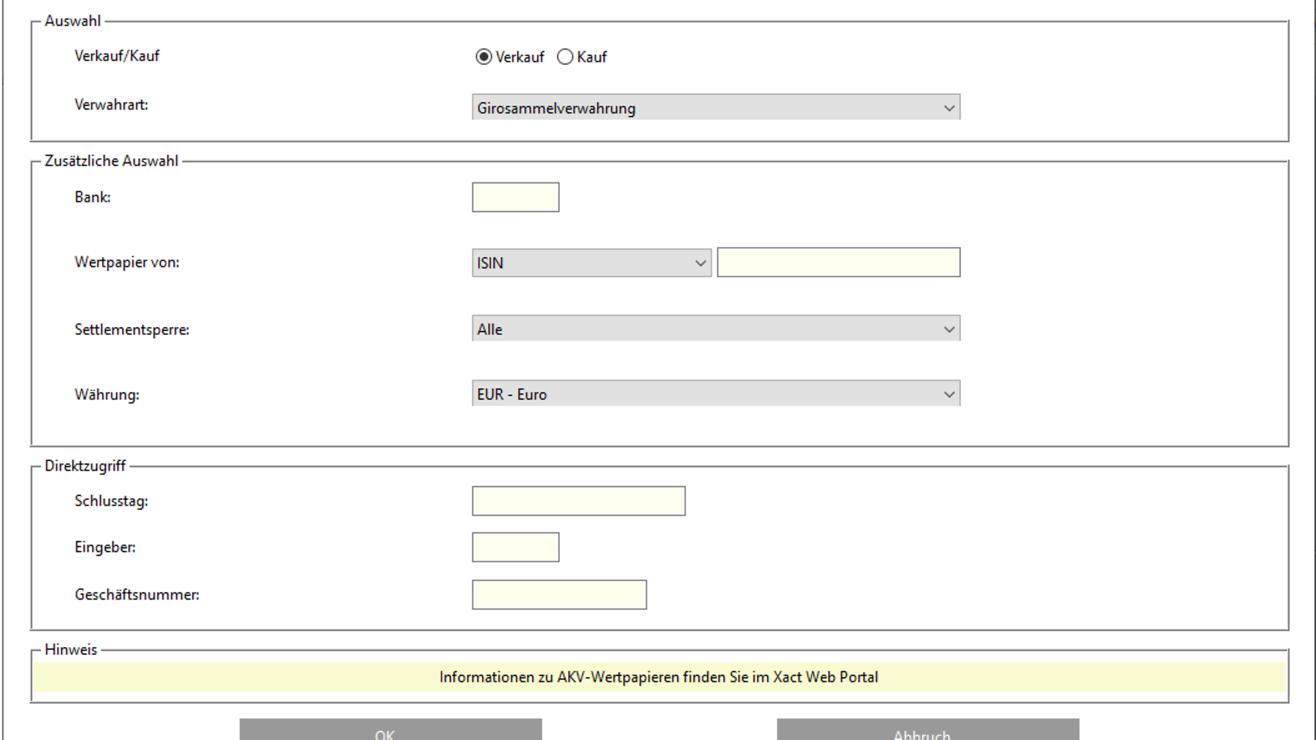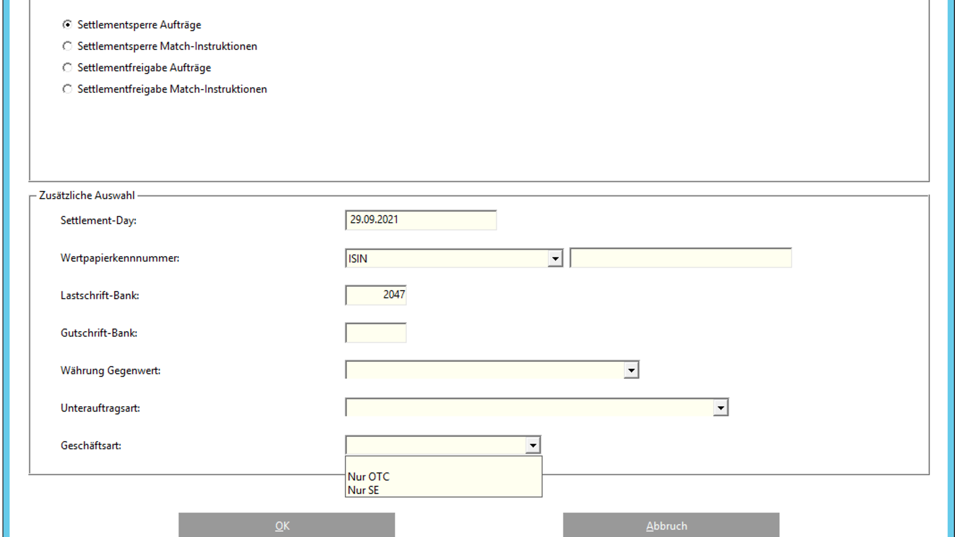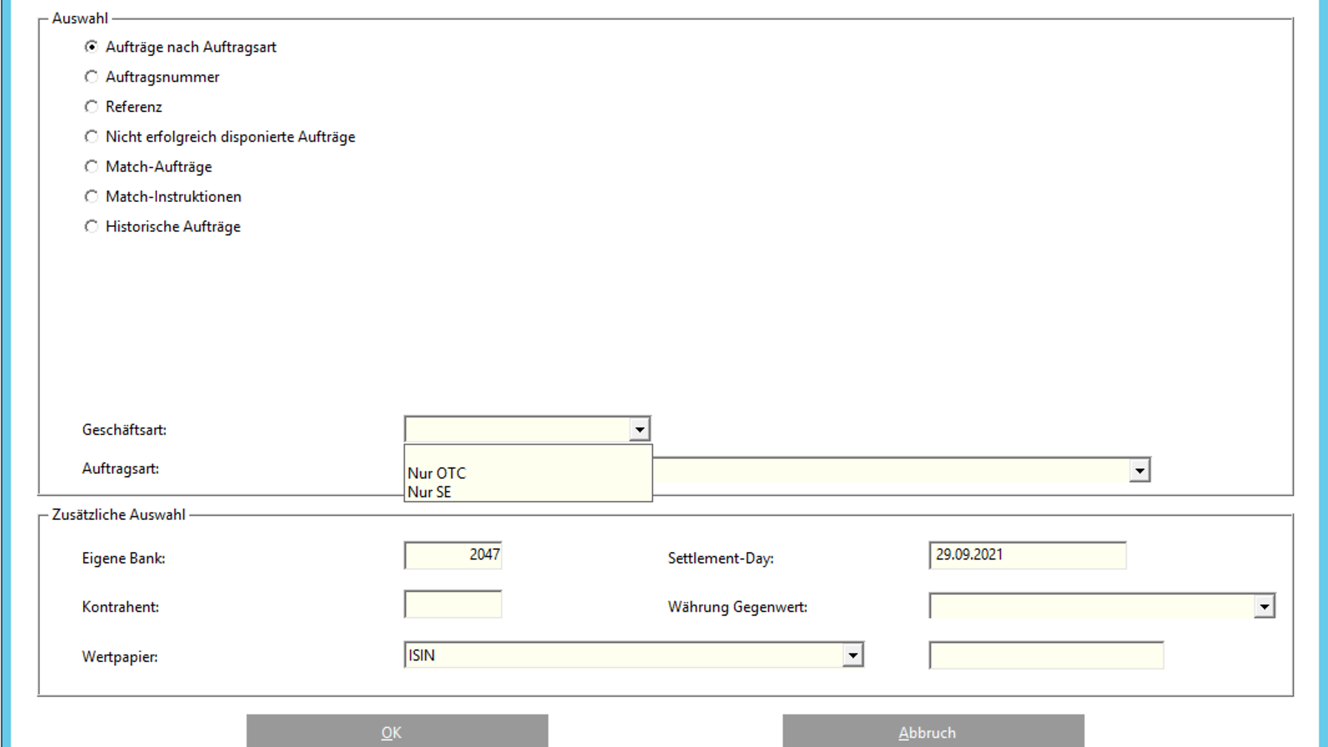 Neben der Pflichteingabe der „Auftragsart“ kann die Lastschrift-Bank und / oder die Gutschrift-Bank ausgefüllt werden. Zusätzlich kann im neuen Feld „Geschäftsart“ ein Wert eingegeben werden, um die Auswahl zu verfeinern.