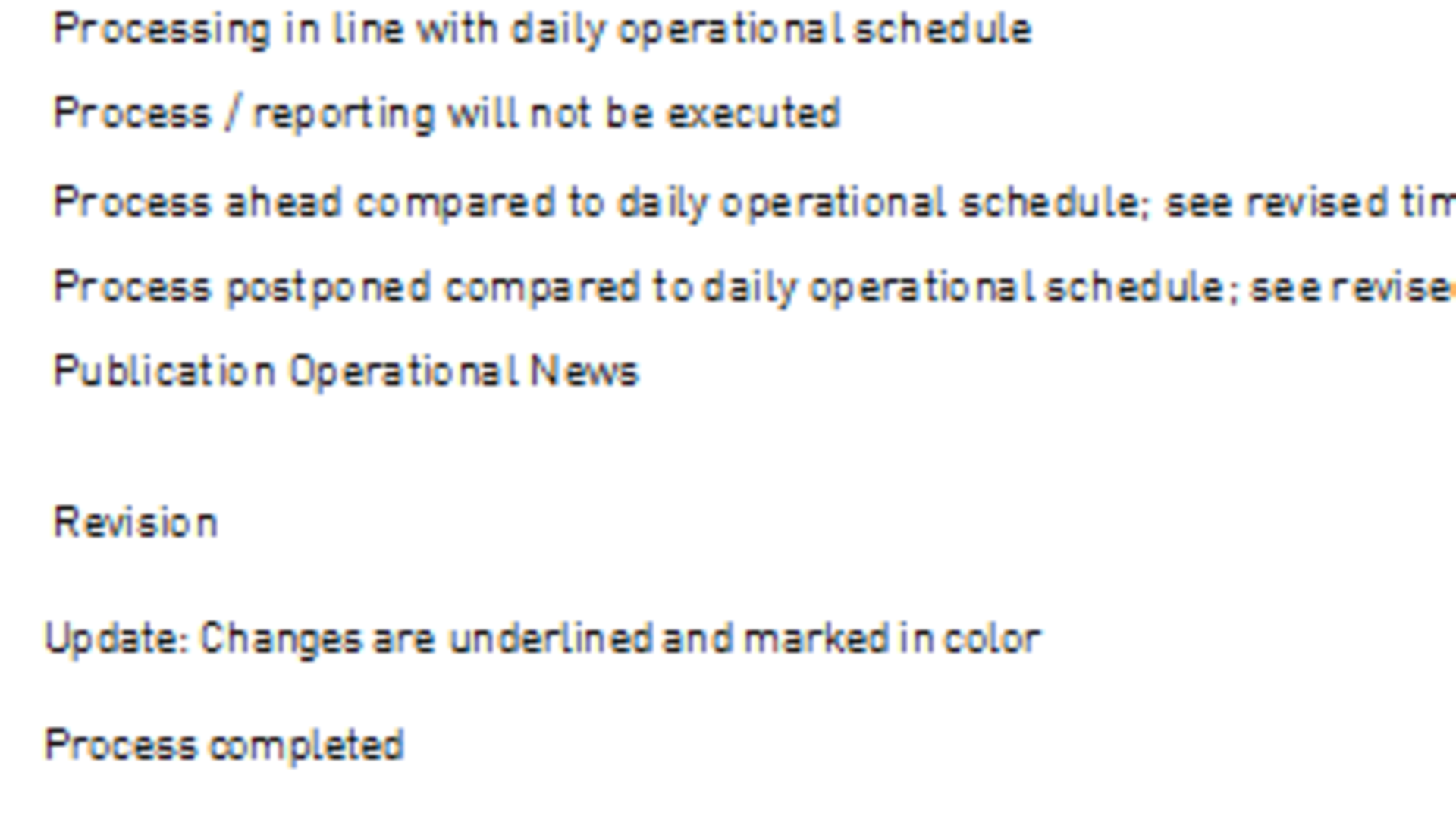 The timeline created by CBF is based on the T2S Playbook for the deployment weekend that was provided end of September 2021. The plan covers the period from Friday, 19 November 2021, at 15:45 to Monday, 22 November 2021, at 06:00. In addition, details are provided related to the LION reporting for system wise cancelled instructions on Monday, 22 November 2021 and Tuesday, 23 November 2021. Events and processes before and after this specific period can be considered as unchanged. To indicate the changes, a column “Revision” is available. It shows: