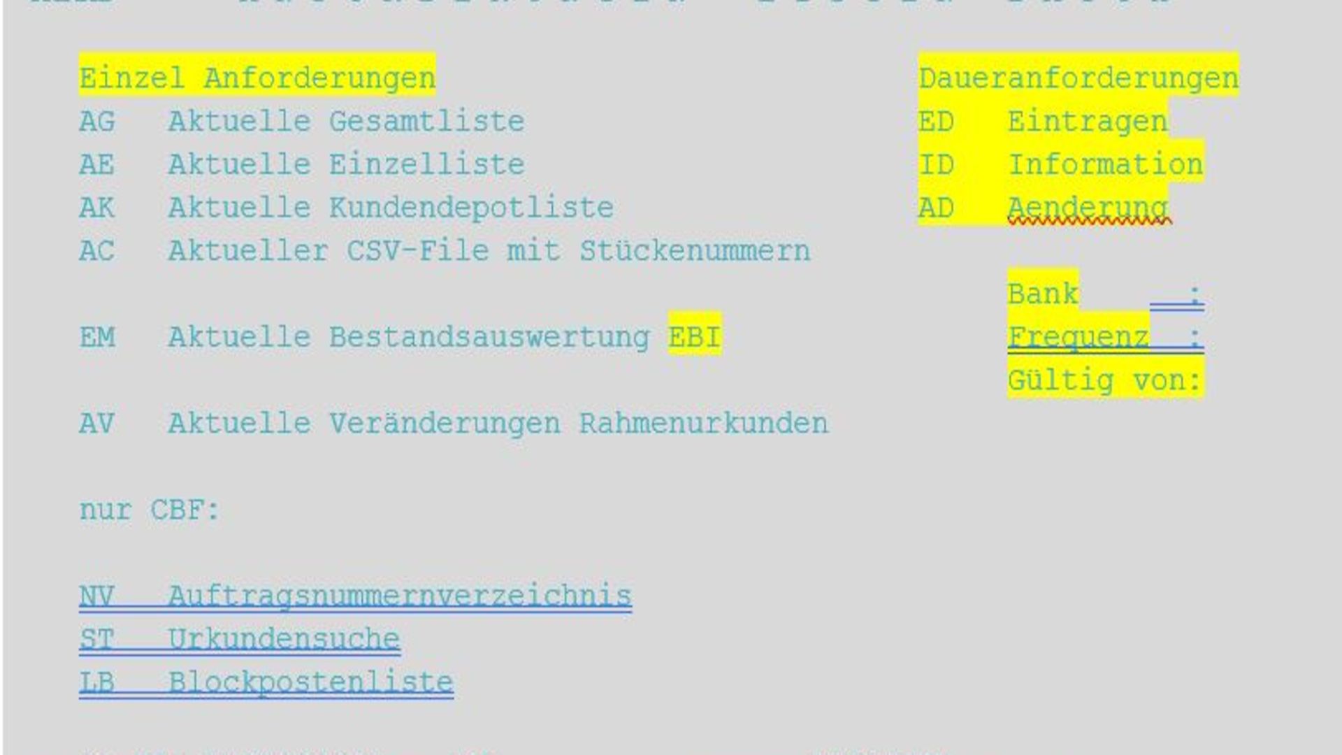 - Current holdings evaluation of issuing bank ("Bestandsauswertungen", EM); and