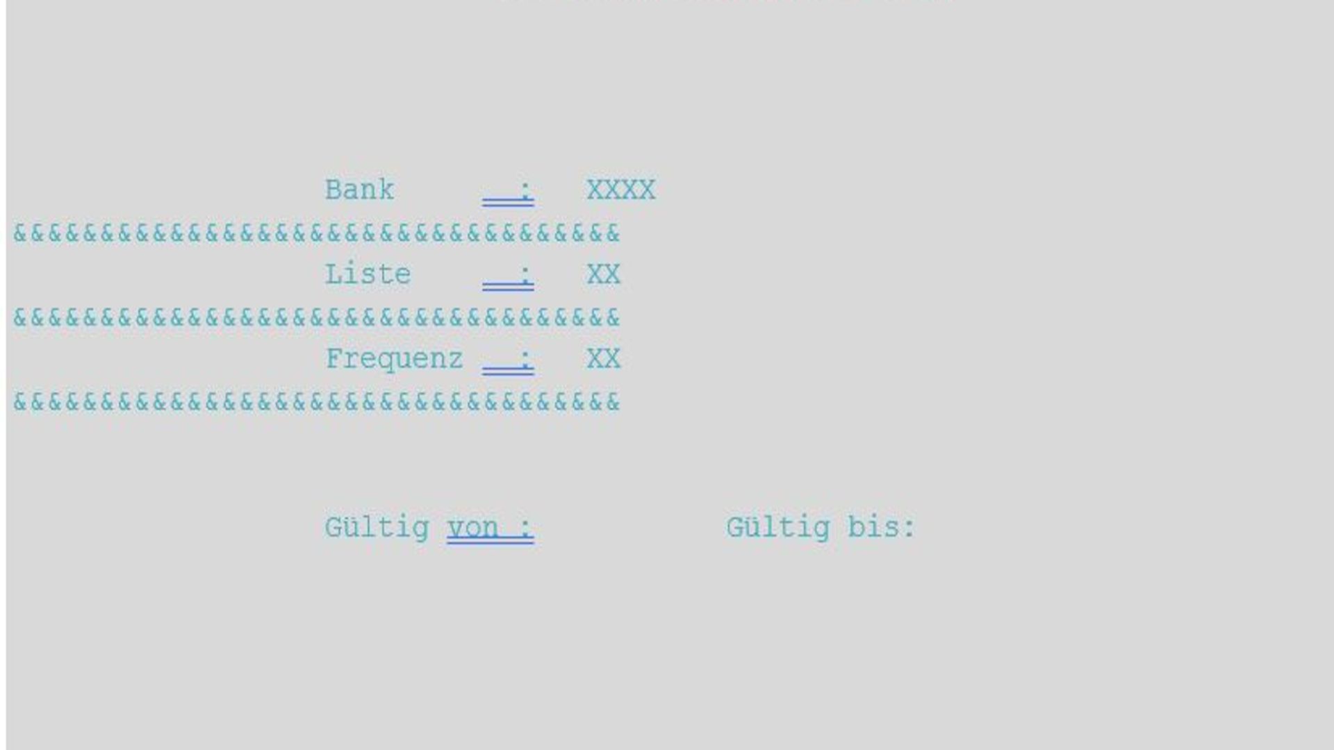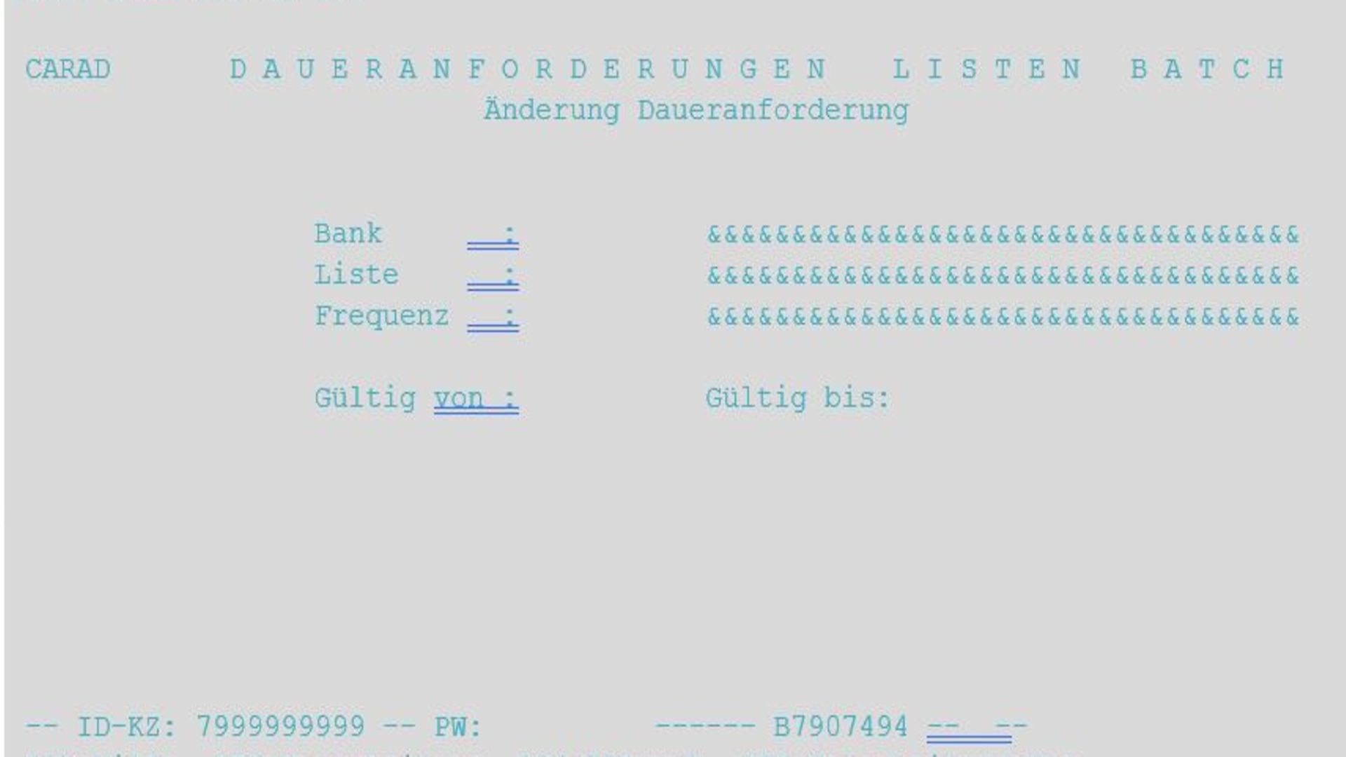 The "Bank:" and "Gültig von:" fields are pre-filled with the master account of the logged-in CARAD user (according to digits 1-4 in the field 'ID-KZ:') and with the next T2S settlement day. The list and frequency selection is displayed on the help screen (see above: AG, EM and AV or 01-03).