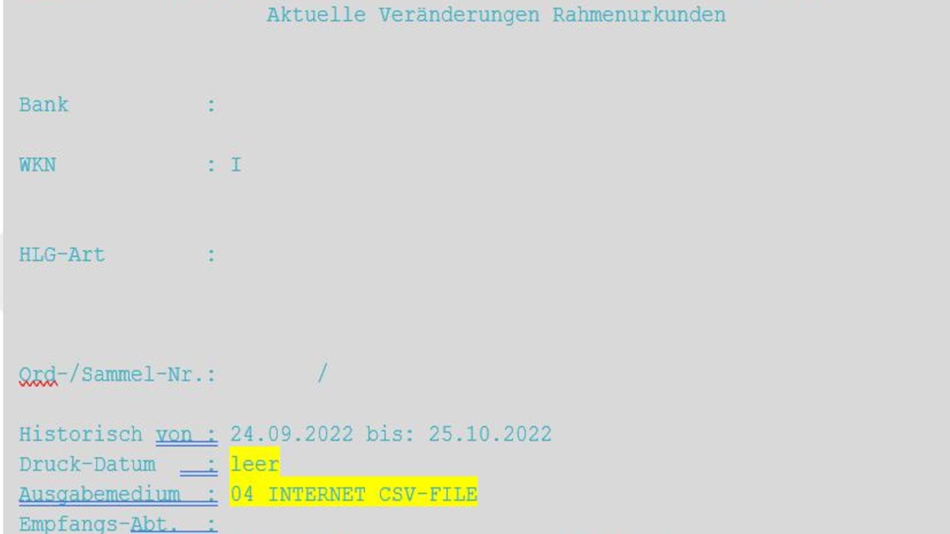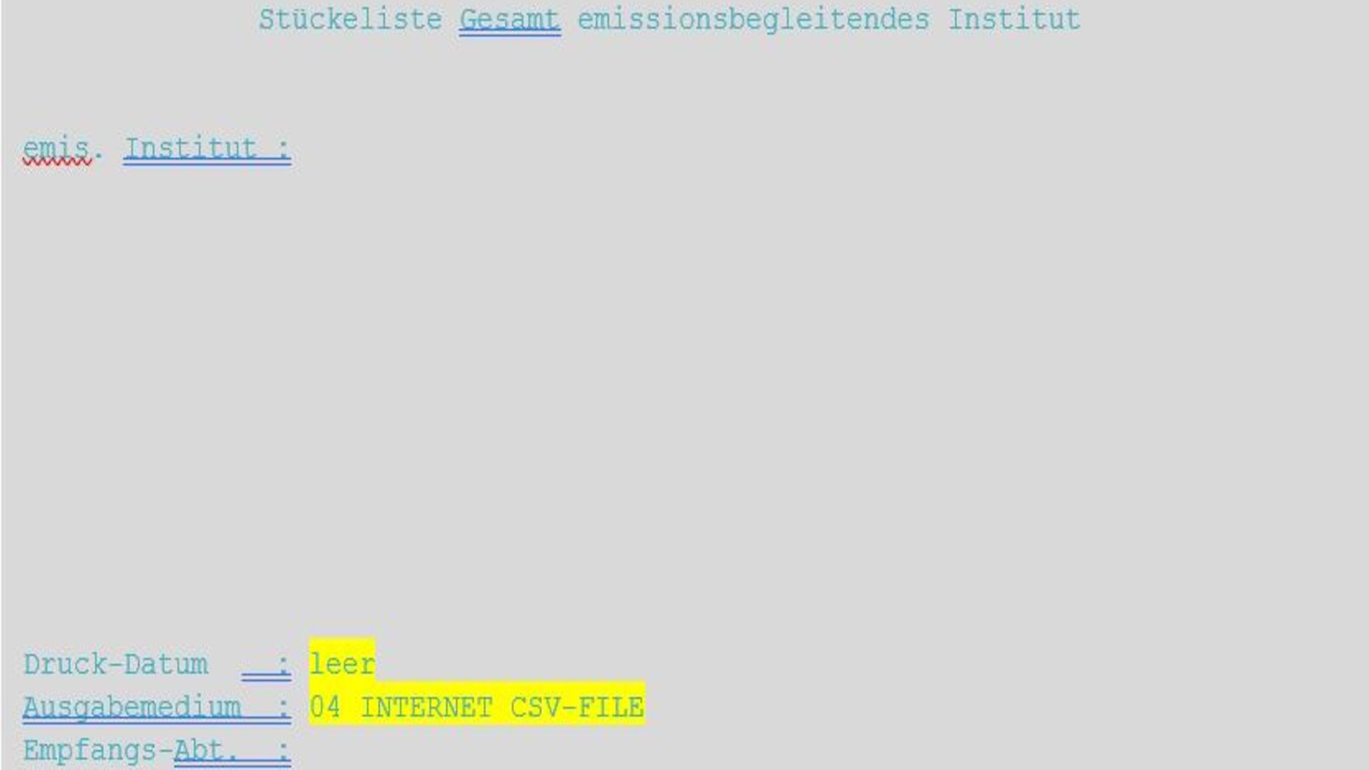 Except for the "Druck-Datum:" (date of print) and "Ausgabemedium:" (output channel) fields, the same validation rules apply as for the previous one-time orders. For standing orders, the "Druck-Datum" field is left blank because it is defined by the frequency of the standing order. The "Ausgabemedium" field is pre-filled with "04 INTERNET CSV-FILE" for the selection EM or AV, whereas the list of all certificate numbers ("Gesamtlisten", AG) can be provided as a list (selection 03) or in CSV format (selection 04).