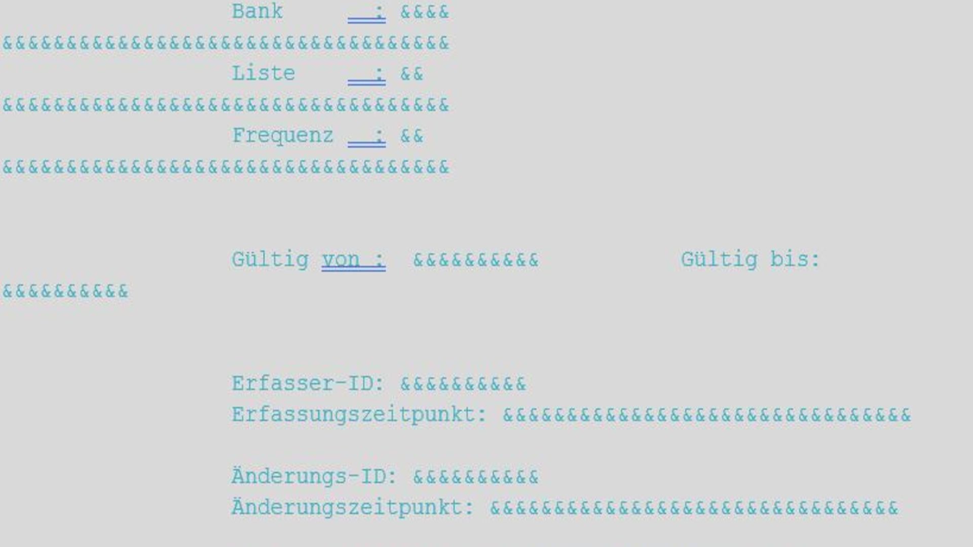 The "Bank:" field is pre-filled with the master account of the logged-in CARAD user (corresponding to digits 1-4 in the "ID-KZ:" field). The "Frequenz:" (see codes 01-03 above) and "Gültig von:" fields can only be filled in for the function codes ID and AD. The PF1 button opens the following help menu:
