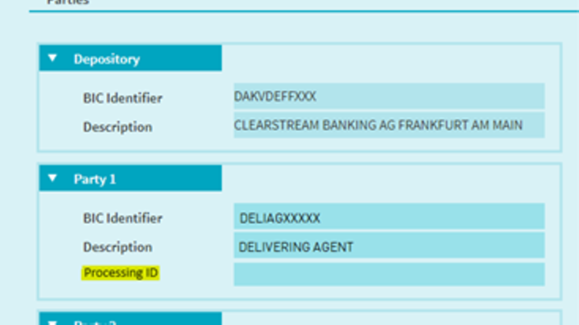 Like this, it will be possible in the OneClearstream and in the T2S reporting to find the self-assigned order reference of the instructions sent as ICP3. The aim is to offer a seamless reconciliation of the settlement feedback for instructions set up in T2S by CBF (DAKVDEFFXXX as "Instructing Party") and hence with a CBF reference. These are the following types of instructions: